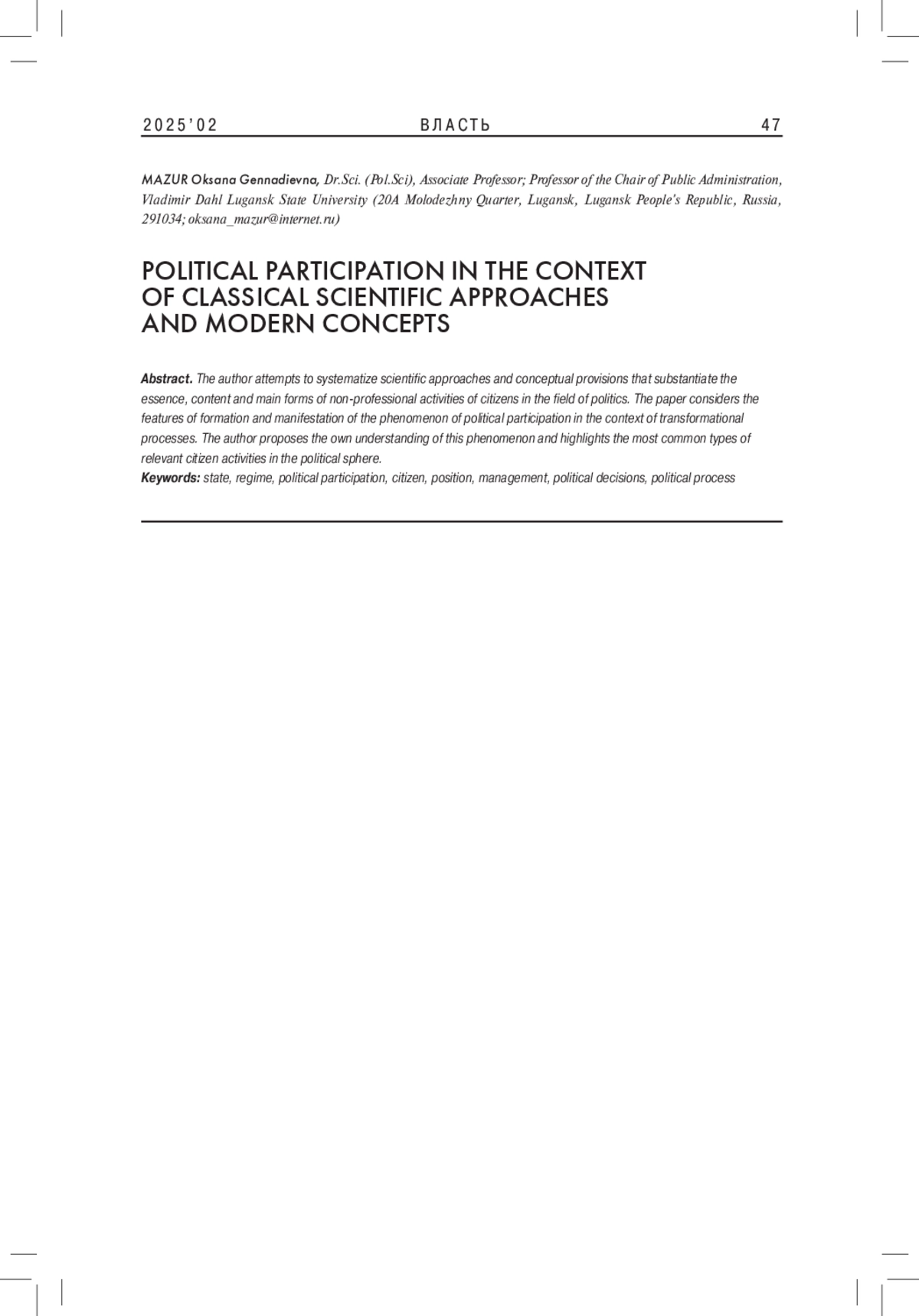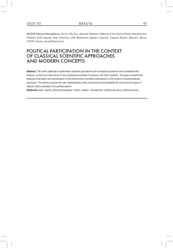 Автором предпринята попытка систематизации научных подходов и концептуальных положений, обосновывающих сущность, содержание и основные формы непрофессиональной деятельности граждан в сфере политики. Рассмотрены особенности формирования и проявления феномена политического участия в условиях трансформационных процессов. Предложено авторское понимание указанного феномена и выделены наиболее распространенные виды актуальных активностей граждан в политической сфере.