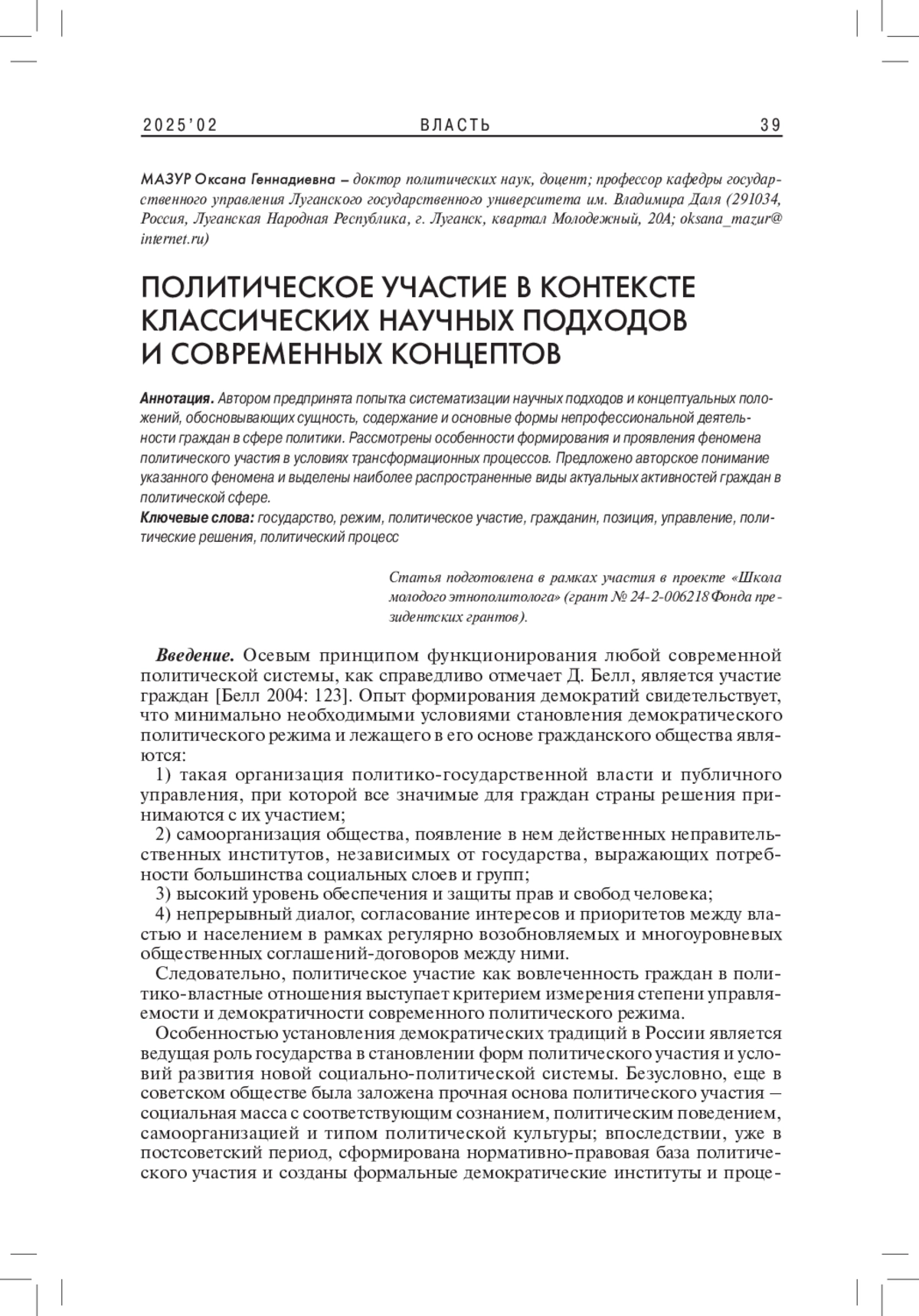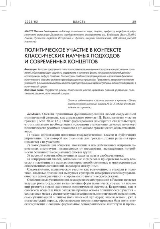 Осевым принципом функционирования любой современной политической системы, как справедливо отмечает Д. Белл, является участие граждан [Белл 2004: 123].