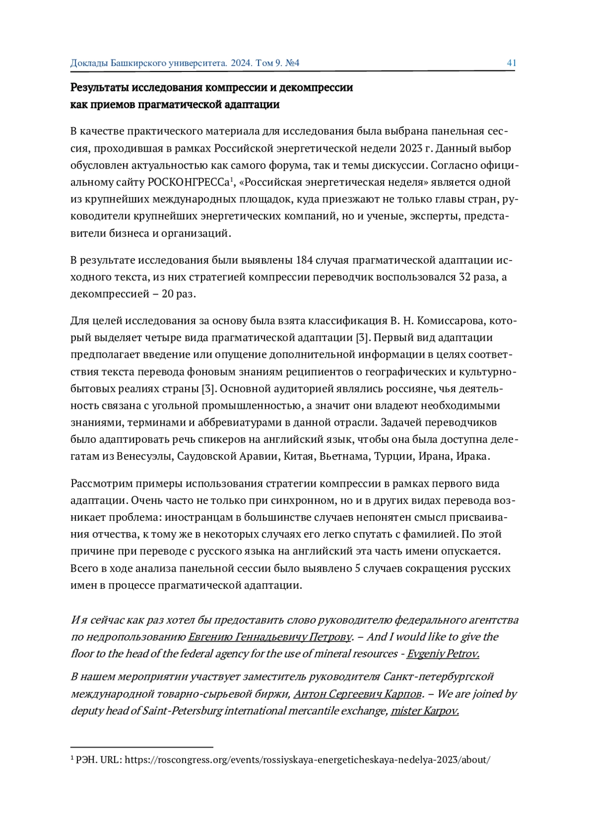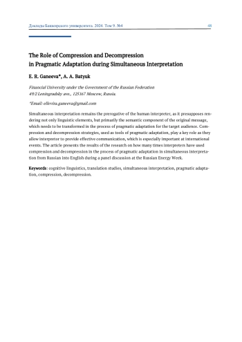 Синхронный перевод остается прерогативой переводчика-человека, поскольку предлагает не только передачу лингвистических элементов, а в первую очередь смысловой составляющей исходного сообщения, которое необходимо преобразовать в процессе прагматической адаптации для целевой аудитории. Стратегии компрессии и декомпрессии как инструменты прагматической адаптации играют ключевую роль, поскольку позволяют обеспечить эффективную коммуникацию, что особенно важно на международных мероприятиях. В статье приводятся результаты исследования синхронного перевода панельной сессии с русского на английский язык в рамках «Российской энергетической недели».