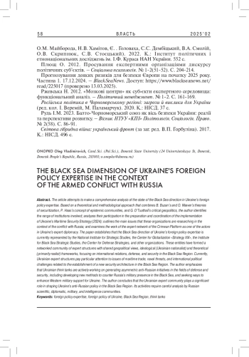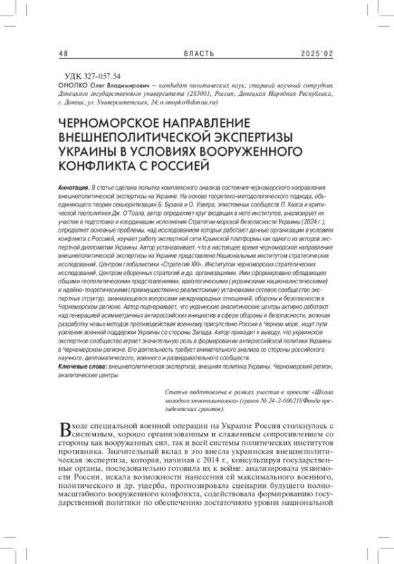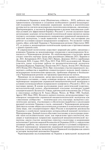 В статье сделана попытка комплексного анализа состояния черноморского направления внешнеполитической экспертизы на Украине. На основе теоретико-методологического подхода, объединяющего теории секьюритизации Б. Бузана и О. Уэвера, эпистемных сообществ П. Хааса и критической геополитики Дж. О’Тоала, автор определяет круг входящих в него институтов, анализирует их участие в подготовке и координации исполнения Стратегии морской безопасности Украины (2024 г.), определяет основные проблемы, над исследованием которых работают данные организации в условиях конфликта с Россией, изучает работу экспертной сети Крымской платформы как одного из акторов экспертной дипломатии Украины. Автор устанавливает, что в настоящее время черноморское направление внешнеполитической экспертизы на Украине представлено Национальным институтом стратегических исследований, Центром глобалистики «Стратегия XXI», Институтом черноморских стратегических исследований, Центром оборонных стратегий и др. организациями. Ими сформировано обладающее общими геополитическими представлениями, идеологическими (украинскими националистическими) и идейно-теоретическими (преимущественно реалистскими) установками сетевое сообщество экспертных структур, занимающееся вопросами международных отношений, обороны и безопасности в Черноморском регионе. Автор подчеркивает, что украинские аналитические центры активно работают над генерацией асимметричных антироссийских инициатив в сфере обороны и безопасности, включая разработку новых методов противодействия военному присутствию России в Черном море, ищут пути усиления военной поддержки Украины со стороны Запада. Автор приходит к выводу, что украинское экспертное сообщество играет значительную роль в формировании антироссийской политики Украины в Черноморском регионе. Его деятельность требует внимательного анализа со стороны российского научного, дипломатического, военного и разведывательного сообществ.