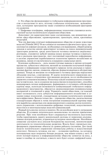 В статье предприняты попытки проанализировать потенциал воздействия искусственного интеллекта на политический процесс, раскрыть проблематику синтеза цифровых технологий, современных достижений в сфере искусственного интеллекта на политические институты и процессы. В статье раскрывается амбивалентность понимания искусственного интеллекта, представлены основные направления управления искусственным интеллектом в контексте политического процесса, обобщаются функции управления рисками внедрения искусственного интеллекта в политический процесс. В статье констатируется неизбежность влияния разрабатываемых опережающими темпами технологий искусственного интеллекта на общество, процесс политического участия, институты гражданского общества. В статье на примере зарубежного опыта выявлются риски имплементации искусственного интеллекта в социально-политические процессы, определяются возможные направления развития ИИ для включения в публичную сферу и политический процесс, влияния ИИ на процесс демократизации общества.