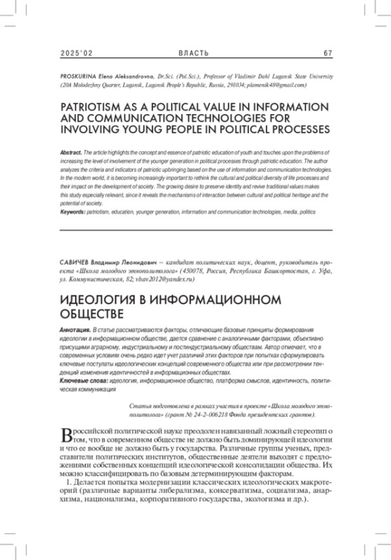 В статье рассматриваются понятие и сущность патриотического воспитания молодежи, затрагиваются проблемы повышения уровня вовлечения молодого поколения в политические процессы посредством патриотического воспитания. Автор анализирует критерии и показатели патриотической воспитанности на основе использования информационно-коммуникационных технологий. Актуальным становится переосмысление культурного и политического многообразия процессов жизнедеятельности и их влияния на развитие общества. Растущее стремление к сохранению самобытности и возрождению традиционных ценностей делает данное исследование особенно актуальным, поскольку оно раскрывает механизмы взаимодействия между культурно-политическим наследием и потенциалом социума.