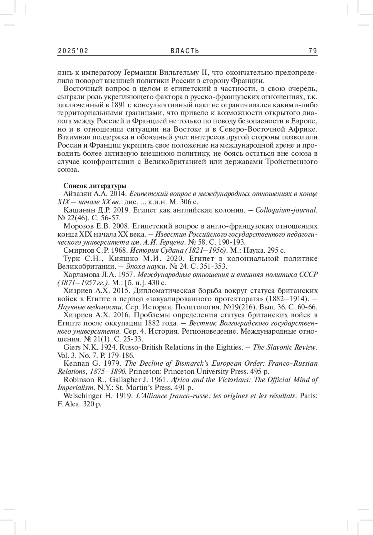 7. Хизриев А.Х. 2015. Дипломатическая борьба вокруг статуса британских войск в Египте в период “завуалированного протектората” (1882-1914). - Научные ведомости. Сер. История. Политология. №19(216). Вып. 36. С. 60-66.