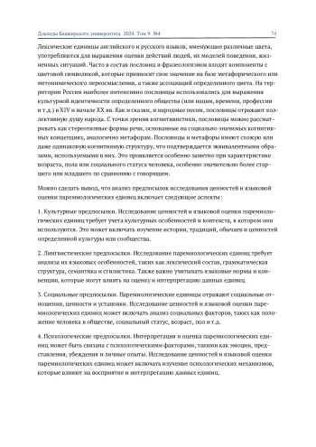 1. Гиниатуллина А. И. Отражение ценностных ориентаций в английских и русских паремиологических единицах // Традиции и инновации в преподавании иностранного языка: мат-лы X Всерос. научно-практ. конф. Казань: Казанский ГМУ, 2020. С. 86-92. EDN: DCGQTG