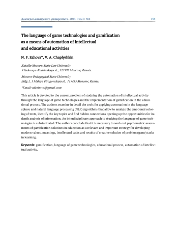 Данная статья посвящена актуальной проблеме изучения автоматизации интеллектуальной деятельности посредством языка игровых технологий и реализации геймификации в образовательном процессе. Авторами детально рассматриваются инструменты применения автоматизации в языковой сфере и алгоритмы обработки естественного языка (NLP), которые позволяют анализировать эмоциональную окраску текстов, определять ключевые темы и находить скрытые связи, что открывает возможности для глубинного анализа информации. Обосновывается междисциплинарный подход к изучению языка игровых технологий. В заключении делается вывод о необходимости разработки психометрических оценок геймификационных решений в образовании в качестве актуальной и важной стратегией выработки современных ценностей, смыслов, интеллектуальных задач и результатов творческого решения проблемных (игровых) задач в обучении.