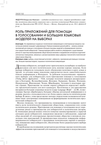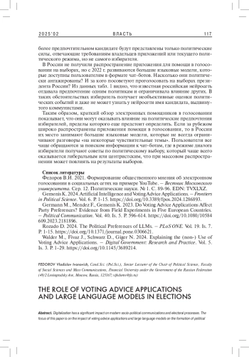 2. Gemenis K. 2024. Artificial Intelligence and Voting Advice Applications. - Frontiers in Political Science. Vol. 6. P. 1-15. DOI: 10.3389/fpos.2024.1286893 EDN: AKCOHI