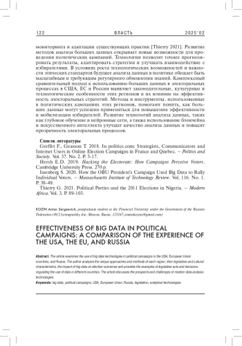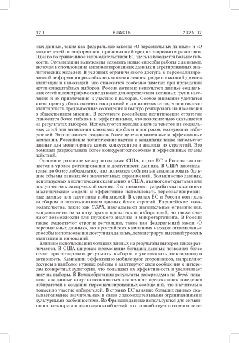В статье анализируется использование технологий больших данных в политических кампаниях США, стран Европейского союза и России. Автор рассматривает уникальные подходы и методы каждого региона, их законодательные и культурные особенности, а также влияние больших данных на результаты выборов, приводит примеры законодательных актов и решений, регулирующих использование данных в разных странах. В статье рассматриваются перспективы и вызовы современных технологий анализа данных.