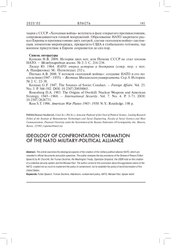 4. Kennan G.F. 1947. The Sources of Soviet Conduct. - Foreign Affairs. Vol. 25. No. 3. P. 566-582. DOI: 10.2307/20030065
