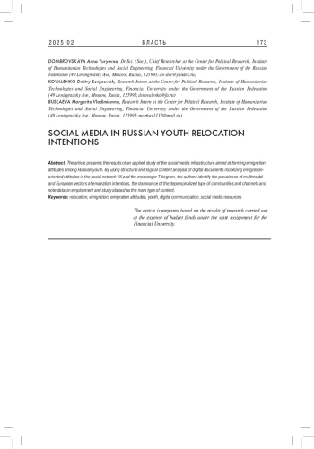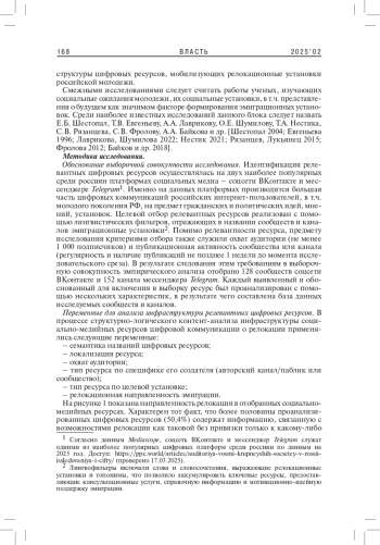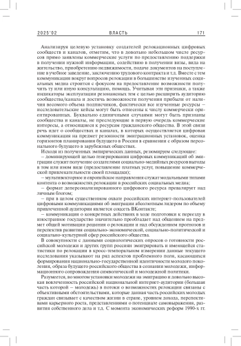 В статье представлены результаты прикладного исследования инфраструктуры социальных медиа, направленных на формирование эмиграционных установок среди российской молодежи. Посредством применения структурно-логического контент-анализа цифровых документов, мобилизующих установки эмиграционной направленности, в социальной сети ВКонтакте и мессенджере Telegram было выделено преобладание мультимодального и европейского векторов эмиграционных интенций, доминирование деперсонализированного типа сообществ и каналов, а также отмечены данные о трудоустройстве и обучении за рубежом в качестве основного типа контента.