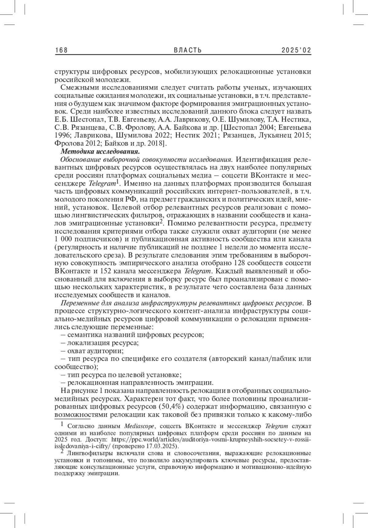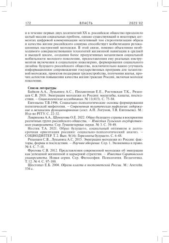 1. Байков А.А., Лукьянец А.С., Письменная Е.Е., Ростовская Т.К., Рязанцев С.В. 2018. Эмиграция молодежи из России: масштабы, каналы, последствия. - Социологические исследования. № 11(415). С. 75-84. EDN: YPHVPN