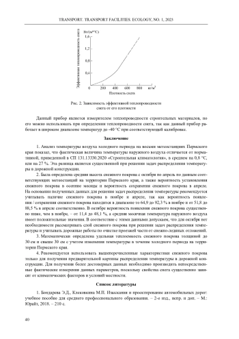 При решении задач распределения температуры в дорожной конструкции, в том числе при определении глубины промерзания, необходимо уделить особое внимание слою снежного покрова, расположенного на откосах и у основания насыпи автомобильной дороги. Дорожная конструкция промерзает неравномерно. Снег имеет малую теплопроводность, что способствует защите грунта от глубокого промерзания. В течение зимнего периода с проезжей части производят механизированную уборку снега, в то время как на откосах и у основания насыпи происходит накопление снежного массива на протяжении всего зимнего периода. Это создает сложную картину промерзания и существенно влияет на распределение изотермы 0 °C внутри дорожной конструкции. В связи с этим необходимо определить характеристики снежного покрова на территории Пермского края для получения более точной картины промерзания конструкции. Характеристики снежного покрова существенно зависят от внешних климатических факторов и условий местности. Произведен анализ климатических характеристик на восьми метеостанциях Пермского края. Выявлено различие между нормативными и фактическими значениями температуры наружного воздуха в период с октября по апрель. Определена средняя месячная высота снежного покрова, а также вероятность установления снежного покрова в осенние месяцы и вероятность сохранения снежного покрова в апреле. Проанализирован опыт исследования теплофизических характеристик снежного покрова российских и зарубежных ученых и выбраны необходимые значения плотности и теплопроводности снега. Рассчитана удельная теплоемкость снежного покрова толщиной до 30 см.