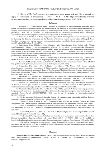 1. Дубинчик О.И. Влияние коррозии бетона и арматуры на долговечность железобетонных пролетных строений мостов [Электронный ресурс] // Наука и прогресс транспорта. Вестник Днепропетровского национального университета железнодорожного транспорта. - 2005. - № 6. - URL: https://cyberleninka.ru/article/n/vliyanie-korrozii-betona-i-armatury-na-dolgovechnost-zhelezobetonnyh-proletnyh-stroeniy-mostov (дата обращения: 20.11.2022). EDN: VWACLD