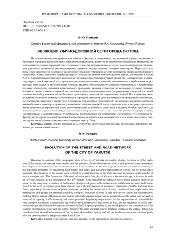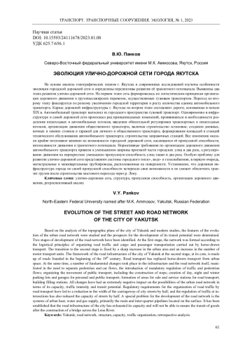 ПАНКОВ В. Ю. ЭВОЛЮЦИЯ УЛИЧНО-ДОРОЖНОЙ СЕТИ ГОРОДА ЯКУТСКА // ТРАНСПОРТ. ТРАНСПОРТНЫЕ СООРУЖЕНИЯ. ЭКОЛОГИЯ. 2023. № 1