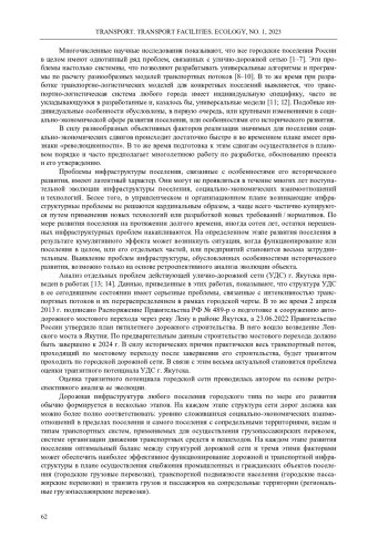 На основе анализа топографических планов г. Якутска и современных исследований изучены особенности эволюции городской дорожной сети и определены перспективы развития её транзитного потенциала. Выявлены два этапа развития улично-дорожной сети. На первом этапе сеть формировалась по логистическим принципам организации дорожного движения и грузопассажирских перевозок, осуществляемых гужевым транспортом. Переход ко второму этапу фиксируется по резкому увеличению городской территории и росту количества единиц автомобильного транспорта. Каркас дорожной инфраструктуры г. Якутска на втором этапе составляют дороги, основанные в начале XIX в. Автомобильный транспорт вытеснил из городского пространства гужевой транспорт. Одновременно в инфраструктуре и самой дорожной сети произошел ряд принципиальных изменений, проявившихся в необходимости разделения пешеходных и автомобильных потоков, введения обязательной регулировки транспортных и пешеходных потоков; организации движения общественного транспорта, включая строительство остановок; создании дневных, ночных и зимних стоянок и гаражей для личного и общественного транспорта; формирования площадей и станций технического обслуживания автомобильного транспорта; строительства заправочных станций. Все изменения оказали крайне негативное влияние на возможности городской дорожной сети, касающиеся её пропускной способности, интенсивности движения и транзитного потенциала. Нормативные требования по организации дорожного движения автомобильного транспорта привели к уменьшению ширины проезжей части городских улиц в два раза, а регулирование движения на перекрестках уменьшило пропускную способность улиц также в два раза. Особую проблему для развития улично-дорожной сети представляют системы городского тепло-, водо- и газоснабжения, в первую очередь, магистральные и межквартальные трубопроводы, расположенные на поверхности. Установлено, что дорожная инфраструктура города по своей пропускной способности исчерпала свои возможности и не сможет обеспечить транзит грузов после строительства мостового перехода через р. Лену.
