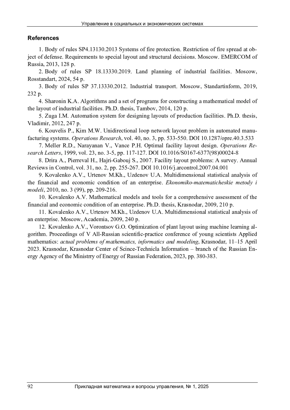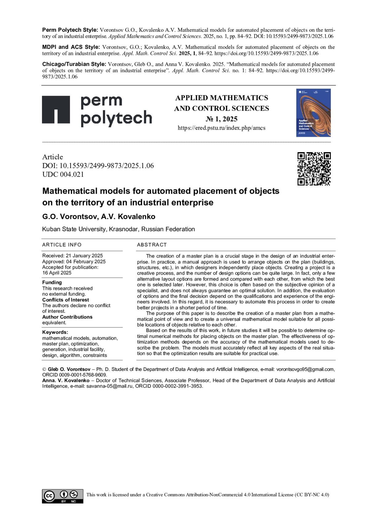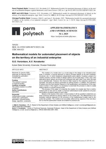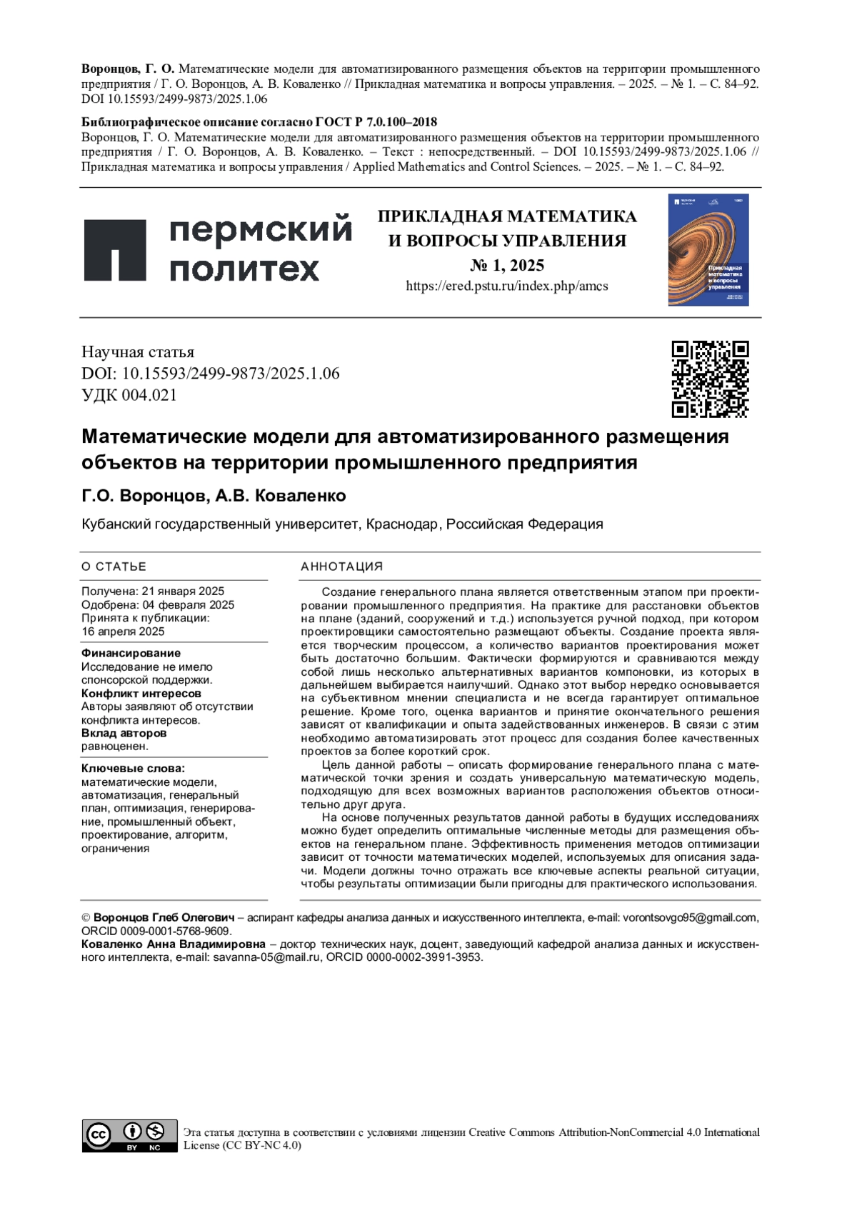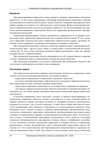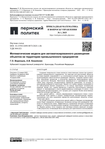 Создание генерального плана является ответственным этапом при проектировании промышленного предприятия. На практике для расстановки объектов на плане (зданий, сооружений и т. д.) используется ручной подход, при котором проектировщики самостоятельно размещают объекты. Создание проекта является творческим процессом, а количество вариантов проектирования может быть достаточно большим. Фактически формируются и сравниваются между собой лишь несколько альтернативных вариантов компоновки, из которых в дальнейшем выбирается наилучший. Однако этот выбор нередко основывается на субъективном мнении специалиста и не всегда гарантирует оптимальное решение. Кроме того, оценка вариантов и принятие окончательного решения зависят от квалификации и опыта задействованных инженеров. В связи с этим необходимо автоматизировать этот процесс для создания более качественных проектов за более короткий срок. Цель данной работы - описать формирование генерального плана с математической точки зрения и создать универсальную математическую модель, подходящую для всех возможных вариантов расположения объектов относительно друг друга. На основе полученных результатов данной работы в будущих исследованиях можно будет определить оптимальные численные методы для размещения объектов на генеральном плане. Эффективность применения методов оптимизации зависит от точности математических моделей, используемых для описания задачи. Модели должны точно отражать все ключевые аспекты реальной ситуации, чтобы результаты оптимизации были пригодны для практического использования.