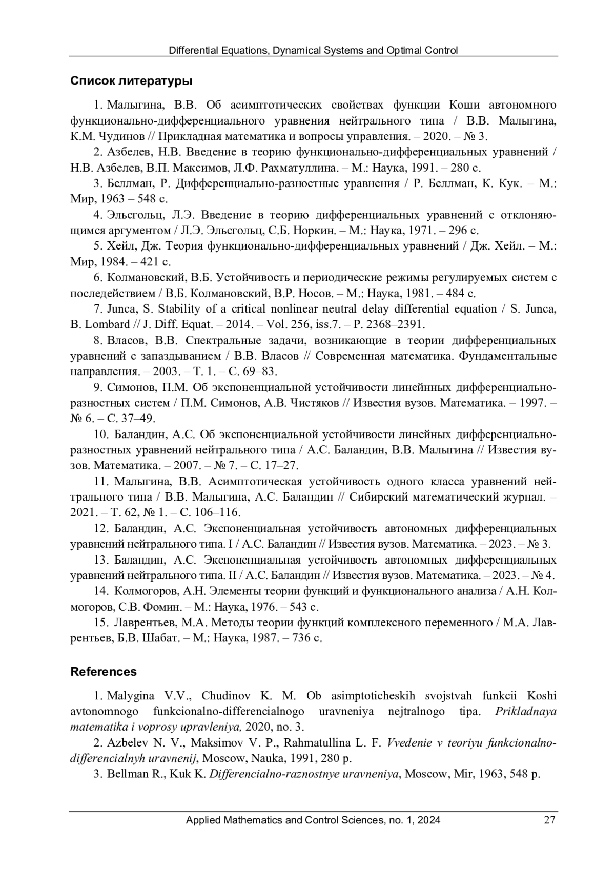12. Баландин, А.С. Экспоненциальная устойчивость автономных дифференциальных уравнений нейтрального типа. I / А.С. Баландин // Известия вузов. Математика. - 2023. - № 3. EDN: USYUZO