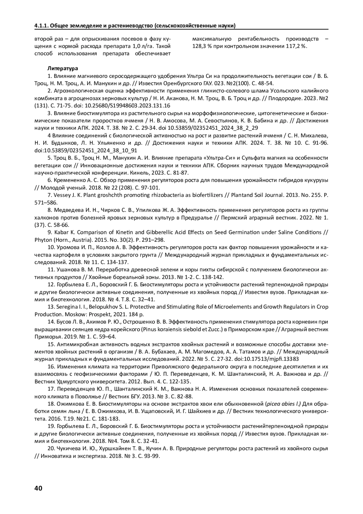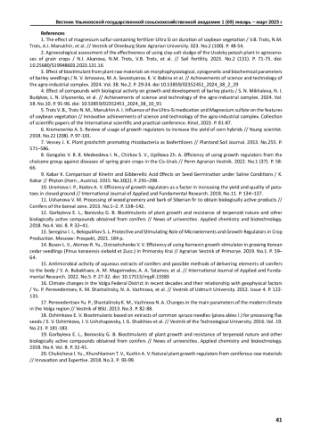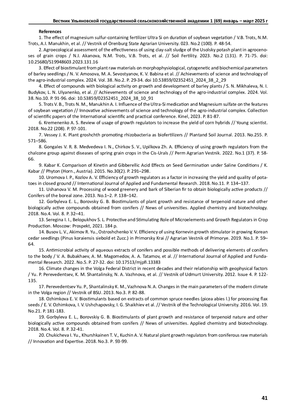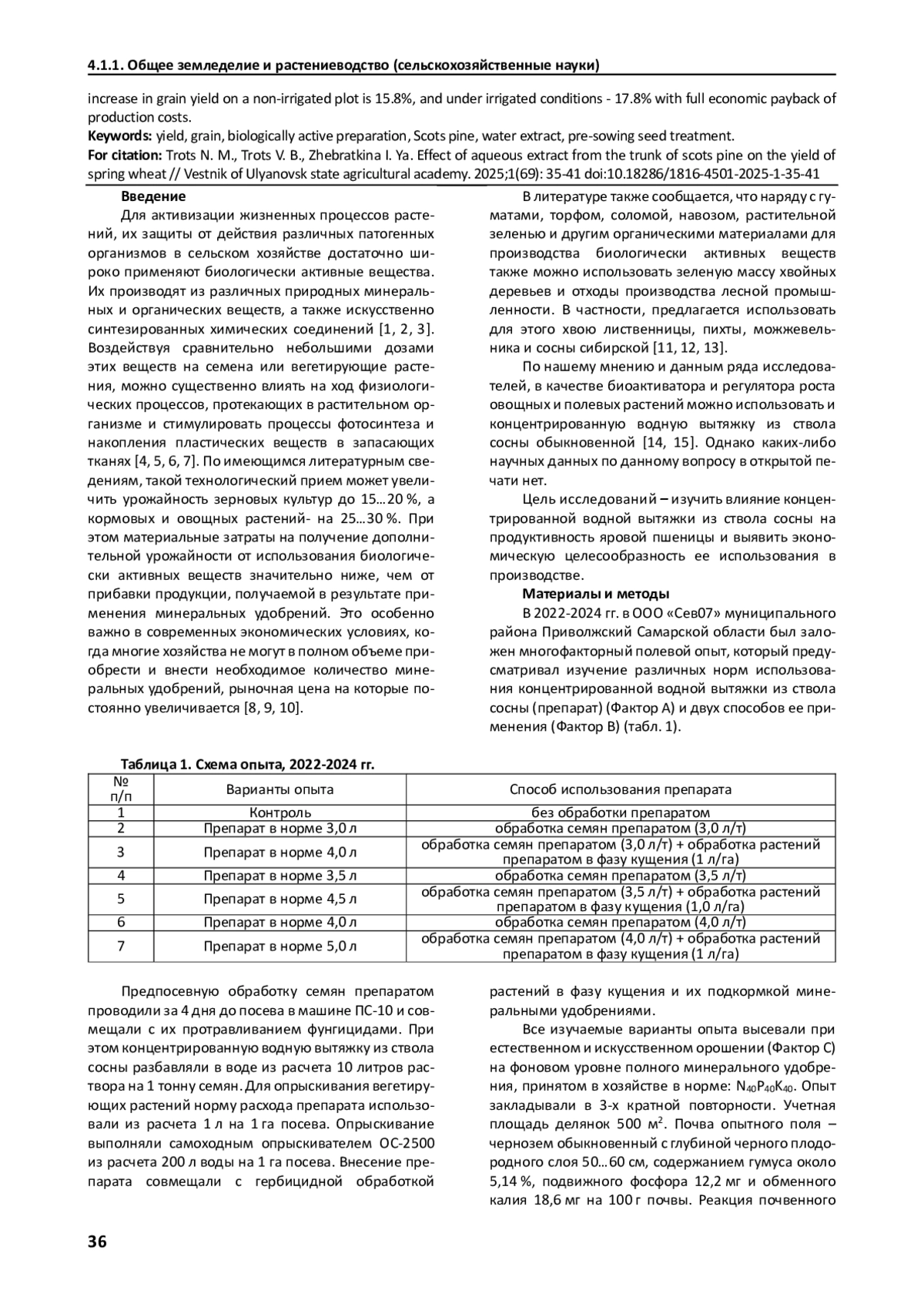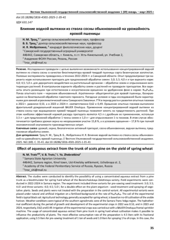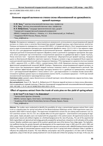 ТРОЦ Н. М., ТРОЦ В. Б., ЖЕБРАТКИНА И. Я. ВЛИЯНИЕ ВОДНОЙ ВЫТЯЖКИ ИЗ СТВОЛА СОСНЫ ОБЫКНОВЕННОЙ НА УРОЖАЙНОСТЬ ЯРОВОЙ ПШЕНИЦЫ // ВЕСТНИК УЛЬЯНОВСКОЙ ГОСУДАРСТВЕННОЙ СЕЛЬСКОХОЗЯЙСТВЕННОЙ АКАДЕМИИ. 2025. № 1 (69)