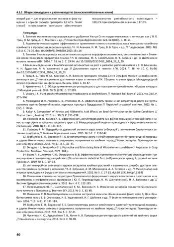 Исследования проводили с целью выявления возможности использования концентрированной водной вытяжки из ствола сосны в качестве биостимулятора яровой твердой пшеницы сорта Безенчукская золотистая. Полевые эксперименты проводились в течение 2022-2024 гг. в Самарской области. Опыт предусматривал три варианта норм использования препарата для предпосевной обработки семян: 3,0; 3,5; 4,0 л и три варианта норм: 4,0; 4,5; 5,0 л. для двукратного воздействия на растительный организм - обработки семян и опрыскивания вегетирующих растений. В контрольном варианте обработку семян и растений не проводили препаратом. Все варианты опыта размещали при естественном и искусственном орошении на удобренном фоне в норме: N40P40K40. Почва опытного поля - чернозем обыкновенный. Агротехника- общепринятая для яровой пшеницы, базирующаяся на безотвальной обработке пахотного горизонта. Погодные условия в годы исследований были характерными для южной агроклиматической зоны Самарского Заволжья. ГТК в период роста и развития опытных посевов в 2022 г. равнялся 0,53, а в 2023 и 2024 гг. соответственно 0,62 и 0,49. Орошение опытных посевов выполняли фронтальной дождевальной машиной BAUER OneAqua. Применение концентрированной водной вытяжки из ствола сосны при выращивании яровой твердой пшеницы позволяет влиять на продуктивность растений. При этом наиболее эффективной нормой расхода препарата является 4,5 л с дробным ее применением, используя 3,5 л - для предпосевной обработки 1 тонны семян и 1,0 л - для опрыскивания 1 га посевов. В этом случае обеспечивается прибавка урожая зерна на неорошаемом участке 15,8 %, а в условиях орошения - 17,8 % при полной экономической окупаемости производственных затрат.