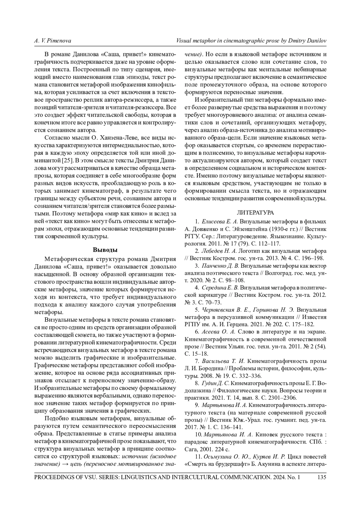 Статья посвящена изучению визуальной метафоры как одного из средств формирования литературной кинематографичности в российской прозе XXI в. Цель статьи - проанализировать случаи употребления визуальной метафоры в прозе современного писателя Дмитрия Данилова и определить ее роль в структуре художественного текста. Методология исследования включает структурный, компонентный и контекстуальный анализ языковых единиц. Лингвистический анализ визуальной метафоры проводится с опорой на теорию метафоры, разработанную Н. Д. Арутюновой, и типологию метафор Ю. Н. Караулова. При рассмотрении языкового материала было установлено, что визуальные метафоры в кинематографичном романе Дмитрия Данилова «Саша, привет!» можно классифицировать по формальному выражению на два вида: с одной стороны, изобразительные метафоры, с другой - графические. В основе и тех, и других метафор лежит образ, что позволяет рассматривать визуальные метафоры как небинарные ментальные структуры, участвующие в порождении переносных смыслов. Как показал анализ исследуемого материала, в прозе Дмитрия Данилова визуальные метафоры являются одним из важных элементов, организующих идиостиль писателя. Ключевой метафорой творчества Данилова стала метафора «мир как кино» и следующая из нее метафора «текст как кино», которые определяют набор соответствующих средств художественного выражения, формирующих зрительный образ. В современном мире, в котором визуальная культура и, в частности, кинематограф занимают доминирующее положение, визуальная метафора в текстах писателей становится не только выражением авторской позиции и мировоззрения, но и отражением языковой культуры носителей современного языка.