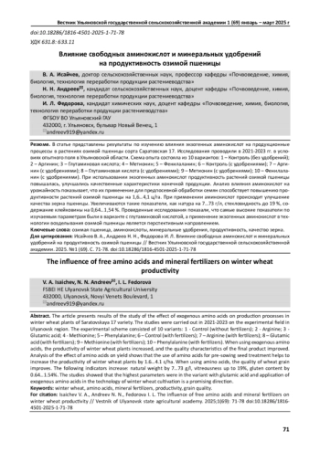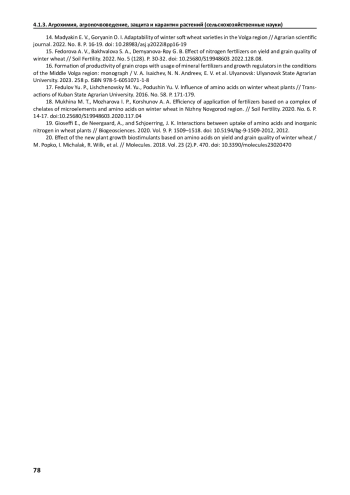 17. Федулов Ю. П., Лищеновский М. Ю., Подушин Ю. В. Влияние аминокислот на растения озимой пшеницы // Труды Кубанского государственного аграрного университета. 2016. № 58. С. 171-179. EDN: WHWKAN
