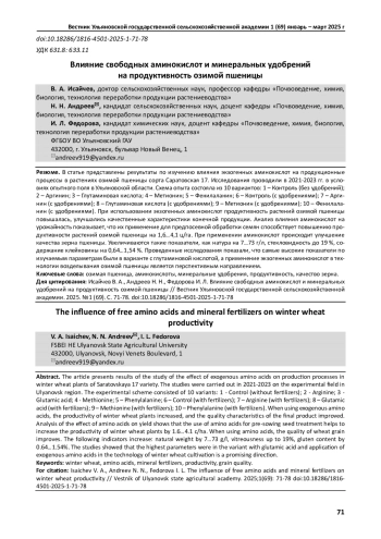 В статье представлены результаты по изучению влияния экзогенных аминокислот на продукционные процессы в растениях озимой пшеницы сорта Саратовская 17. Исследования проводили в 2021-2023 гг. в условиях опытного поля в Ульяновской области. Схема опыта состояла из 10 вариантов: 1 - Контроль (без удобрений); 2 - Аргинин; 3 - Глутаминовая кислота; 4 - Метионин; 5 - Фенилаланин; 6 - Контроль (с удобрениями); 7 - Аргинин (с удобрениями); 8 - Глутаминовая кислота (с удобрениями); 9 - Метионин (с удобрениями); 10 - Фенилаланин (с удобрениями). При использовании экзогенных аминокислот продуктивность растений озимой пшеницы повышалась, улучшались качественные характеристики конечной продукции. Анализ влияния аминокислот на урожайность показывает, что их применение для предпосевной обработки семян способствует повышению продуктивности растений озимой пшеницы на 1,6…4,1 ц/га. При применении аминокислот происходит улучшение качества зерна пшеницы. Увеличиваются такие показатели, как натура на 7.73 г/л, стекловидность до 19 %, содержание клейковины на 0,64.1,54 %. Проведенные исследования показали, что самые высокие показатели по изучаемым параметрам были в варианте с глутаминовой кислотой, а применение экзогенных аминокислот в технологии возделывания озимой пшеницы является перспективным направлением.