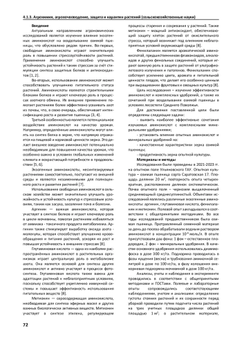 Актуальным направлением агрономических исследований является изучение влияния экзогенных аминокислот на возделывание озимой пшеницы, что обусловлено рядом причин. Во-первых, свободные аминокислоты играют значительную роль в повышении стрессоустойчивости растений. Применение аминокислот способно улучшить устойчивость растений к таким стрессам за счёт стимуляции синтеза защитных белков и антиоксидантов [1, 2].