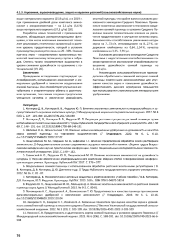 1. Котляров Д. В., Котляров В. В., Федулов Ю. П. Влияние экзогенных аминокислот на морозостойкость и засухоустойчивость зерновых колосовых культур // Международный научно-исследовательский журнал. 2017. № 4 (58). С. 134 - 139. DOI: 10.23670/IRJ.2017.58.089 EDN: YKMOTP