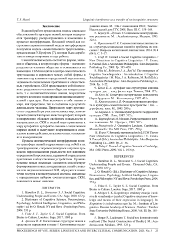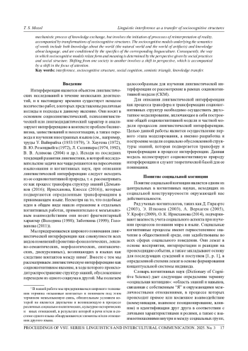 Изучение лингвистической интерференции привлекает внимание ученых в течение многих десятилетий, существуют разные взгляды и подходы к изучению данного явления. До настоящего времени интерференция изучалась главным образом с социолингвистической, психолингвистической и лингводидактической точек зрения в контексте проблем билингвизма, заимствований, неологизации, перевода и изучения иностранных языков. Опираясь на последние тенденции развития лингвистики, данное исследование рассматривает лингвистическую интерференцию как социокогнитивное явление, т. е. как процесс трансфера, распространения и трансформации структур знаний, обусловленный переходом из одного социума в другой. Целью данной работы является разработка и построение модели социально обусловленной структуры знаний, которая подвергается передаче и изменению в процессе интерференции. Исходной точкой для построения социокогнитивной модели интерференции является модель «семиотического треугольника» У. Крофта, который выделяет форму, значение и социум, подчеркивая, что отношение «форма - значение» разделяется членами общества и основывается на конвенции. В исследовании показано, что лингвистическая интерференция не представляет собой исключительно механистический процесс обмена знаниями, а предполагает запуск процессов переосмысления реальности, сопровождающийся трансформациями социокогнитивных структур. Социокогнитивные модели, лежащие в основе семантики слов, включают в себя как знания о мире (природном мире и мире артефактов), так и знания о языке, при этом обусловлены спецификой соответствующей лингвокультуры. Следовательно, способ, которым социокогнитивные модели скрепляют между собой форму и значение, определяется точкой зрения (перспективой), задаваемой социальными практиками и общественным устройством. При переходе из одного социума в другой происходит смещение перспективы, которая сопровождается сменой фокуса внимания.