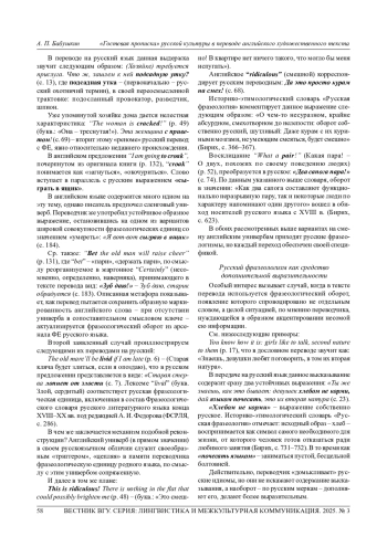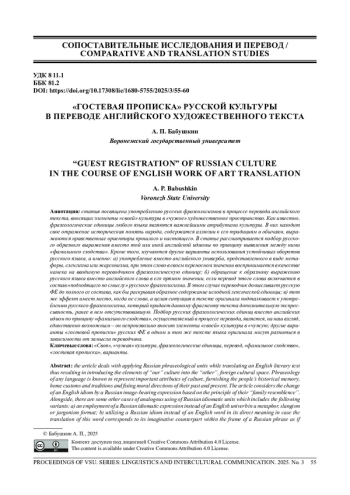 БАБУШКИН А. П. «ГОСТЕВАЯ ПРОПИСКА» РУССКОЙ КУЛЬТУРЫ В ПЕРЕВОДЕ АНГЛИЙСКОГО ХУДОЖЕСТВЕННОГО ТЕКСТА // ВЕСТНИК ВОРОНЕЖСКОГО ГОСУДАРСТВЕННОГО УНИВЕРСИТЕТА. СЕРИЯ: ЛИНГВИСТИКА И МЕЖКУЛЬТУРНАЯ КОММУНИКАЦИЯ. 2025. № 3