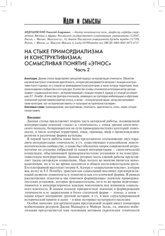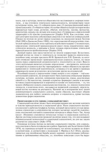 Данная статья представляет авторский подход к интерпретации этничности. Объектом изучения выступает этническая идентичность, которая рассматривается автором с позиции конструктивистского подхода, но с опорой на примордиалистские категории, в числе которых территория, язык, происхождение сообщества и его культура. В качестве основы этнической интеграции автор рассматривает «социальный инстинкт», интерпретируемый с позиции теории А. Адлера и с опорой на концепцию Л. Г. Почебут. В качестве фактора этногенеза, влияющего на групповую мобилизацию и обретение этнической группой самовосприятия этноса, а затем - этнокультурной нации, автор рассматривает такие категории, как «историческая память» и «культурно-историческое наследие».