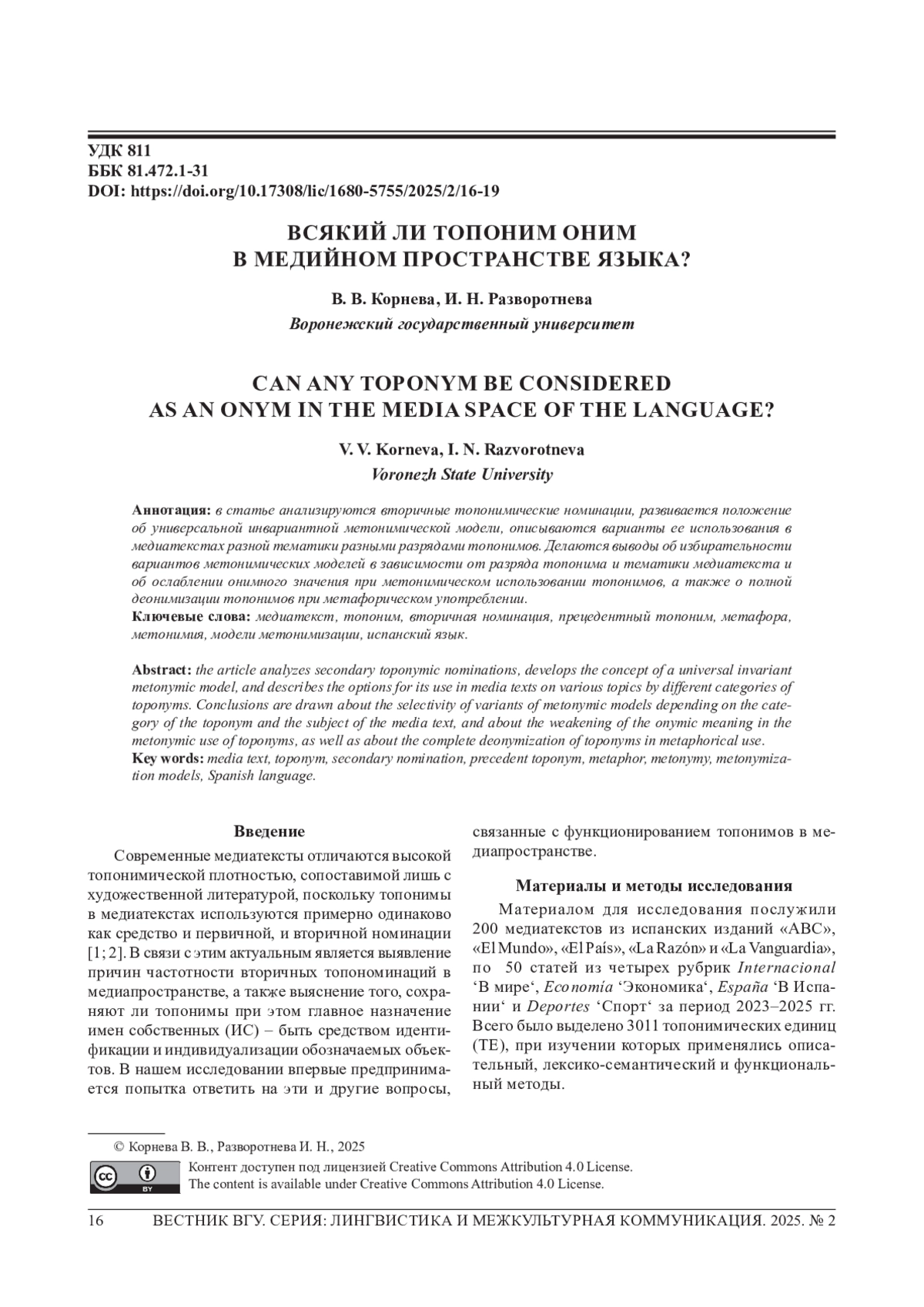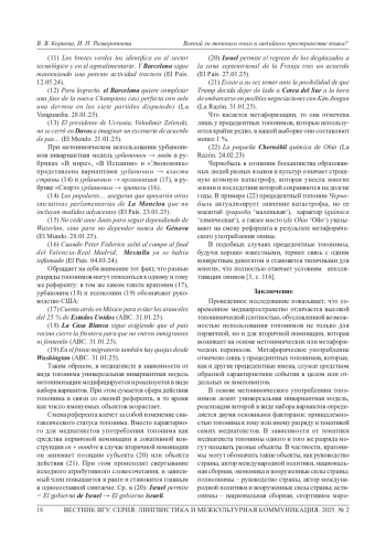 1. Корнева В. В., Разворотнева И. Н. Топонимы в заголовках медиатекстов (на материале испанского языка) // Вестник Воронеж. гос. ун-та. Сер.: Лингвистика и межкультурная коммуникация. 2023. № 4. C. 83-89.