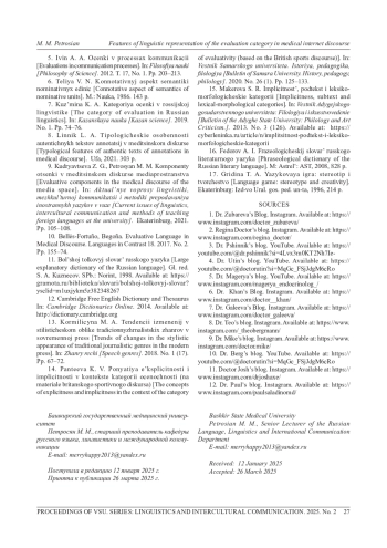 9. Кудрявцева З. Г., Петросян М. М. Компоненты оценки в медицинском дискурсе медиапространства // Актуальные вопросы лингвистики, межкультурной коммуникации и методики преподавания иностранных языков в вузе. Екатеринбург: Урал. гос. горн. ун-т, 2021. С. 105-108. EDN: ANSSYE