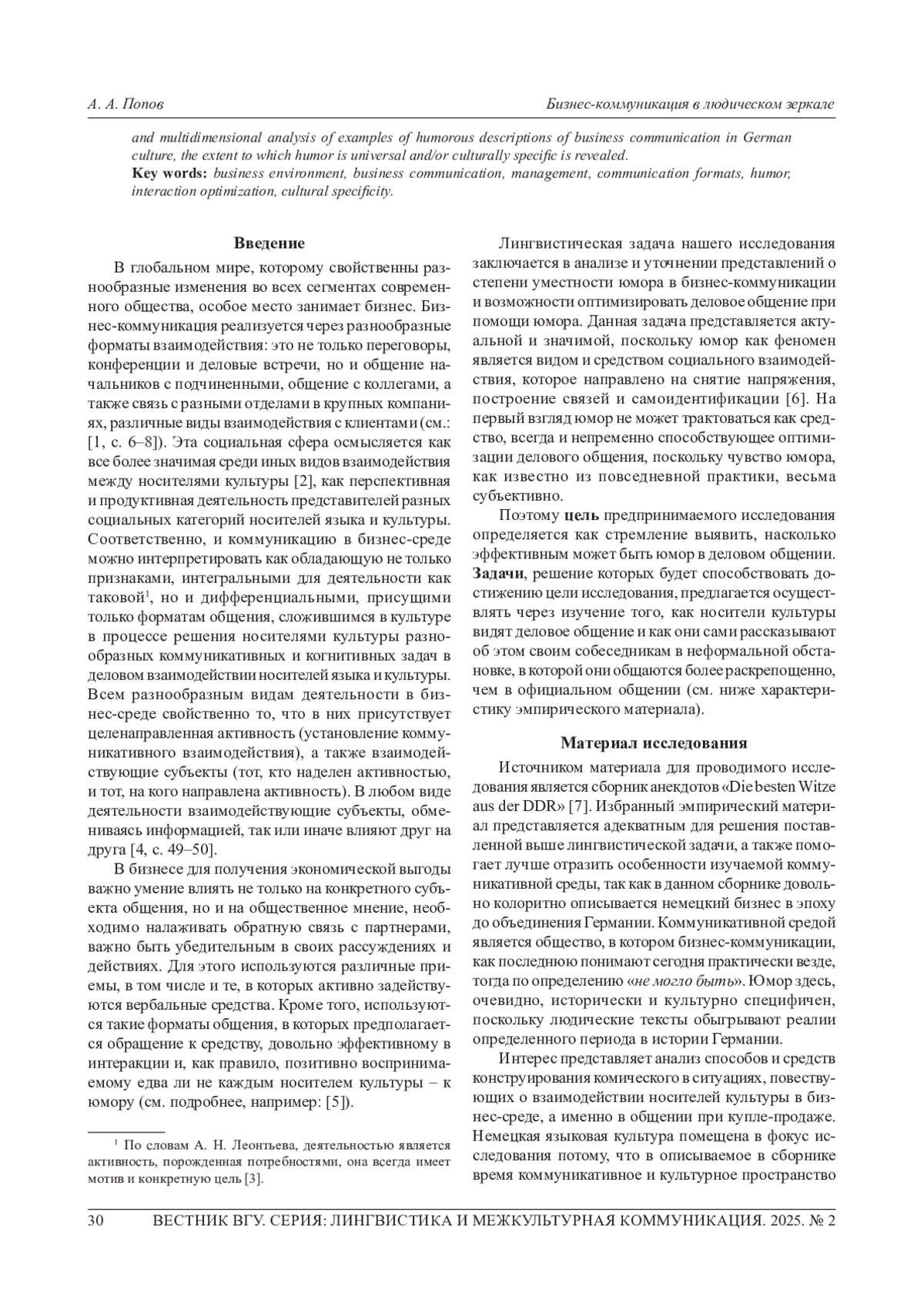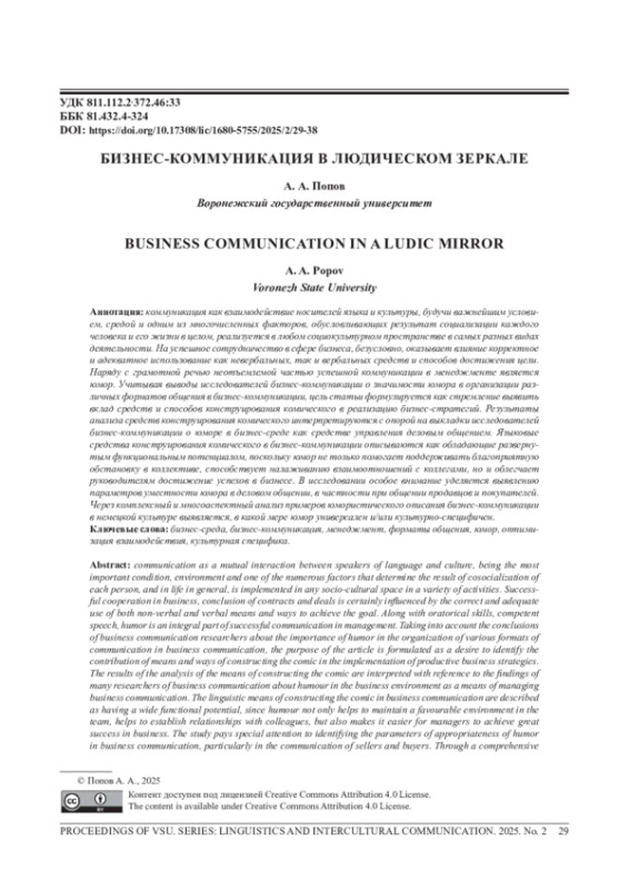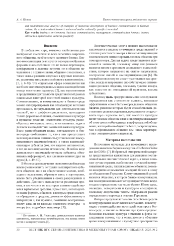 Коммуникация как взаимодействие носителей языка и культуры, будучи важнейшим условием, средой и одним из многочисленных факторов, обусловливающих результат социализации каждого человека и его жизни в целом, реализуется в любом социокультурном пространстве в самых разных видах деятельности. На успешное сотрудничество в сфере бизнеса, безусловно, оказывает влияние корректное и адекватное использование как невербальных, так и вербальных средств и способов достижения цели. Наряду с грамотной речью неотъемлемой частью успешной коммуникации в менеджменте является юмор. Учитывая выводы исследователей бизнес-коммуникации о значимости юмора в организации различных форматов общения в бизнес-коммуникации, цель статьи формулируется как стремление выявить вклад средств и способов конструирования комического в реализацию бизнес-стратегий. Результаты анализа средств конструирования комического интерпретируются с опорой на выкладки исследователей бизнес-коммуникации о юморе в бизнес-среде как средстве управления деловым общением. Языковые средства конструирования комического в бизнес-коммуникации описываются как обладающие развернутым функциональным потенциалом, поскольку юмор не только помогает поддерживать благоприятную обстановку в коллективе, способствует налаживанию взаимоотношений с коллегами, но и облегчает руководителям достижение успехов в бизнесе. В исследовании особое внимание уделяется выявлению параметров уместности юмора в деловом общении, в частности при общении продавцов и покупателей. Через комплексный и многоаспектный анализ примеров юмористического описания бизнес-коммуникации в немецкой культуре выявляется, в какой мере юмор универсален и/или культурно-специфичен.