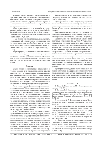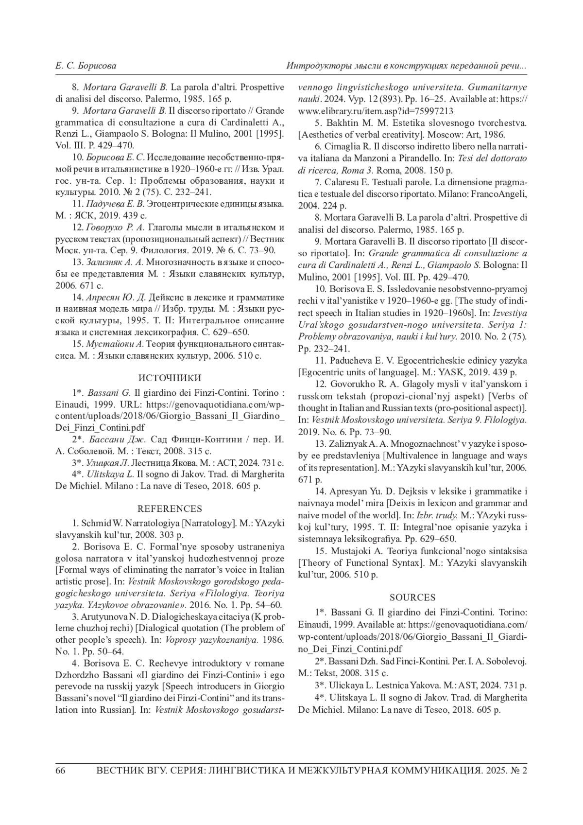 2. Борисова Е. С. Формальные способы устранения голоса нарратора в итальянской художественной прозе // Вестник Моск. город. пед. ун-та. Сер. “Филология. Теория языка. Языковое образование”. 2016. № 1. С. 54-60. EDN: VURRDB