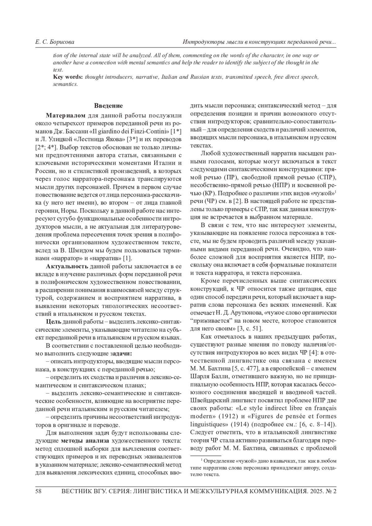 В данной статье на материале романа Дж. Бассани «II giardino dei Finzi-Contini» (нарратив от 1-го лица) и Л. Улицкой «Лестница Якова» (нарратив от 3-го лица) и их переводов, соответственно, на русский и итальянский языки рассматриваются интродукторы переданной речи, вводящие мысли персонажа. Сравнительно-сопоставительный анализ языка оригинала и перевода нацелен на выделение лексико-семантических и синтаксических особенностей, влияющих на восприятие итальянским и русским читателем конструкций переданной речи, выраженных в художественном тексте прямым, косвенным и несобственно-прямым способом. Определение степени воздействия интродукторов на читателя в разных режимах интерпретации эгоцентрических единиц в контексте традиционного нарратива и свободного косвенного дискурса, который характеризуется широким использованием несобственно-прямой речи, является не только ключом к выделению говорящего или мыслящего субъекта в полифонически организованном пространстве текста, но и указанием на некоторые типологические несоответствия, которые следует учитывать при изучении итальянского и русского языков и при переводе с них. Помимо ментальных глаголов и их позиции по отношению к вводимому высказыванию, будут проанализированы предикаты внутреннего временного состояния, перцептивные глаголы, возвратные речевые глаголы, акциональные глаголы, в которых действие совмещается с указанием на внутреннее состояние, - все они, комментируя слова персонажа, тем или иным образом имеют связь с ментальной семантикой и помогают читателю определить субъект переданной мысли в тексте.