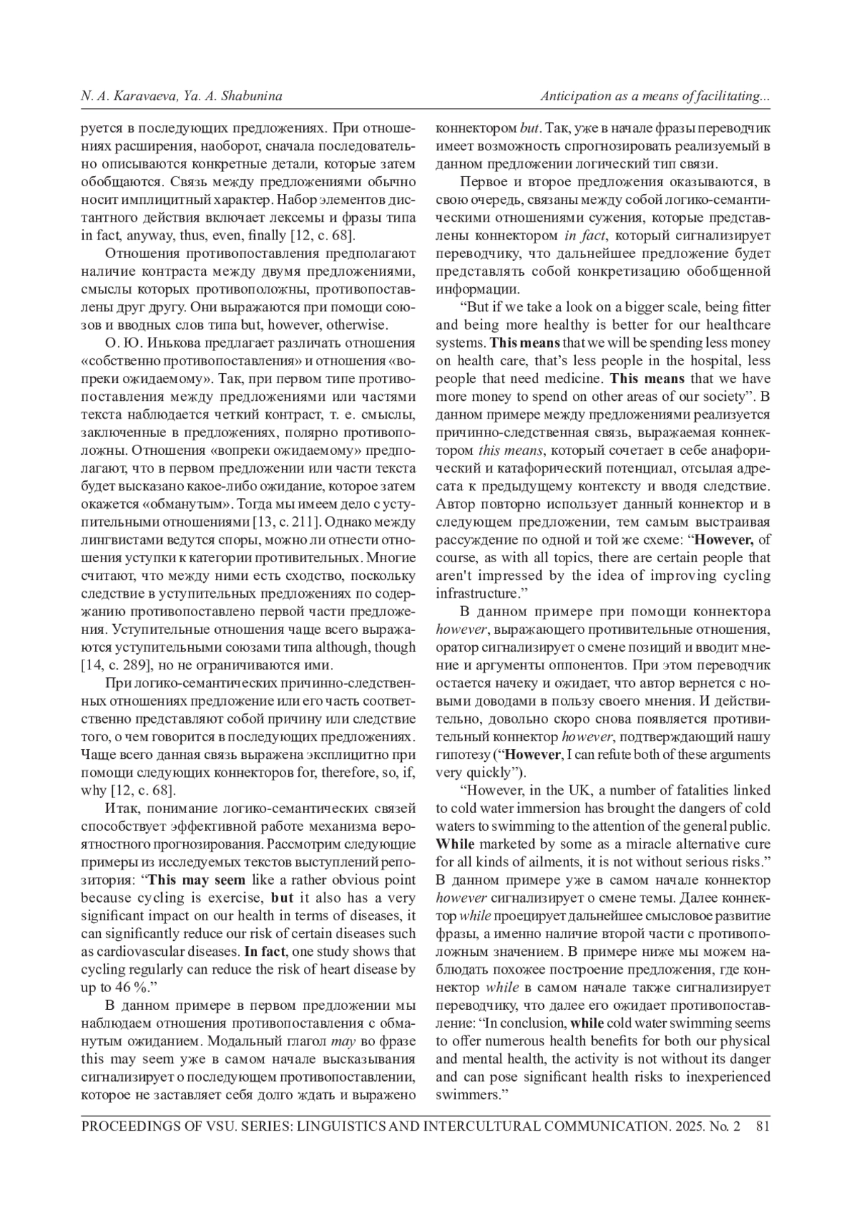 В настоящей статье рассматривается вопрос о возможности оптимизации процесса синхронного перевода с помощью механизма вероятностного прогнозирования посредством анализа явных и скрытых сигналов последующего развития текста. Эти сигналы могут представлять собой элементы дистантного действия, которые проецируют дальнейшее развертывание мысли и позволяют переводчику предвосхищать еще не полученную им информацию и таким образом экономить время и усилия по перекодированию предназначенного для перевода звучащего текста. Постоянное внимание к указанным элементам как в процессе подготовки специалистов по синхронному переводу, так и на этапе осуществления профессионального перевода в реальных условиях, освоение арсенала таких средств наряду с другими специфическими навыками обеспечивает высокое качество текста перевода и придает переводчику уверенность в собственных возможностях, снижает уровень его тревожности и способствует достижению взаимопонимания между спикером и аудиторией. Освоение набора логико-семантических отношений в тексте служит основой для анализа того, как функционируют прогнозирующие элементы дистантного действия в конкретном контексте и, таким образом, является обязательной составляющей подготовки переводчиков-синхронистов и непременным атрибутом арсенала средств профессионального синхрониста.