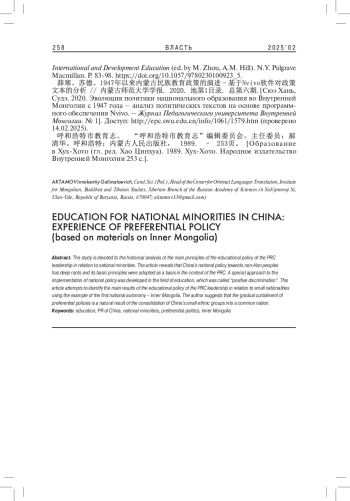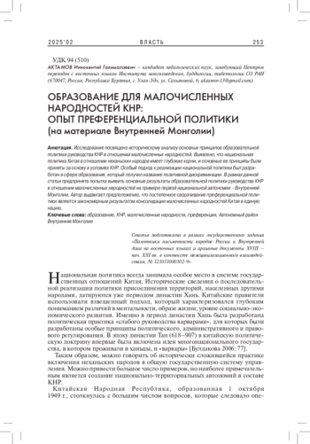 Исследование посвящено историческому анализу основных принципов образовательной политики руководства КНР в отношении малочисленных народностей. Выявлено, что национальная политика Китая в отношении неханьских народов имеет глубокие корни, и основные ее принципы были приняты за основу в условиях КНР. Особый подход к реализации национальной политики был разработан в сфере образования, который получил название позитивной дискриминации. В рамках данной статьи предпринята попытка выявить основные результаты образовательной политики руководства КНР в отношении малочисленных народностей на примере первой национальной автономии - Внутренней Монголии. Автор выдвигает предположение, что постепенное сворачивание преференциальной политики является закономерным результатом консолидации малочисленных народностей Китая в единую нацию.