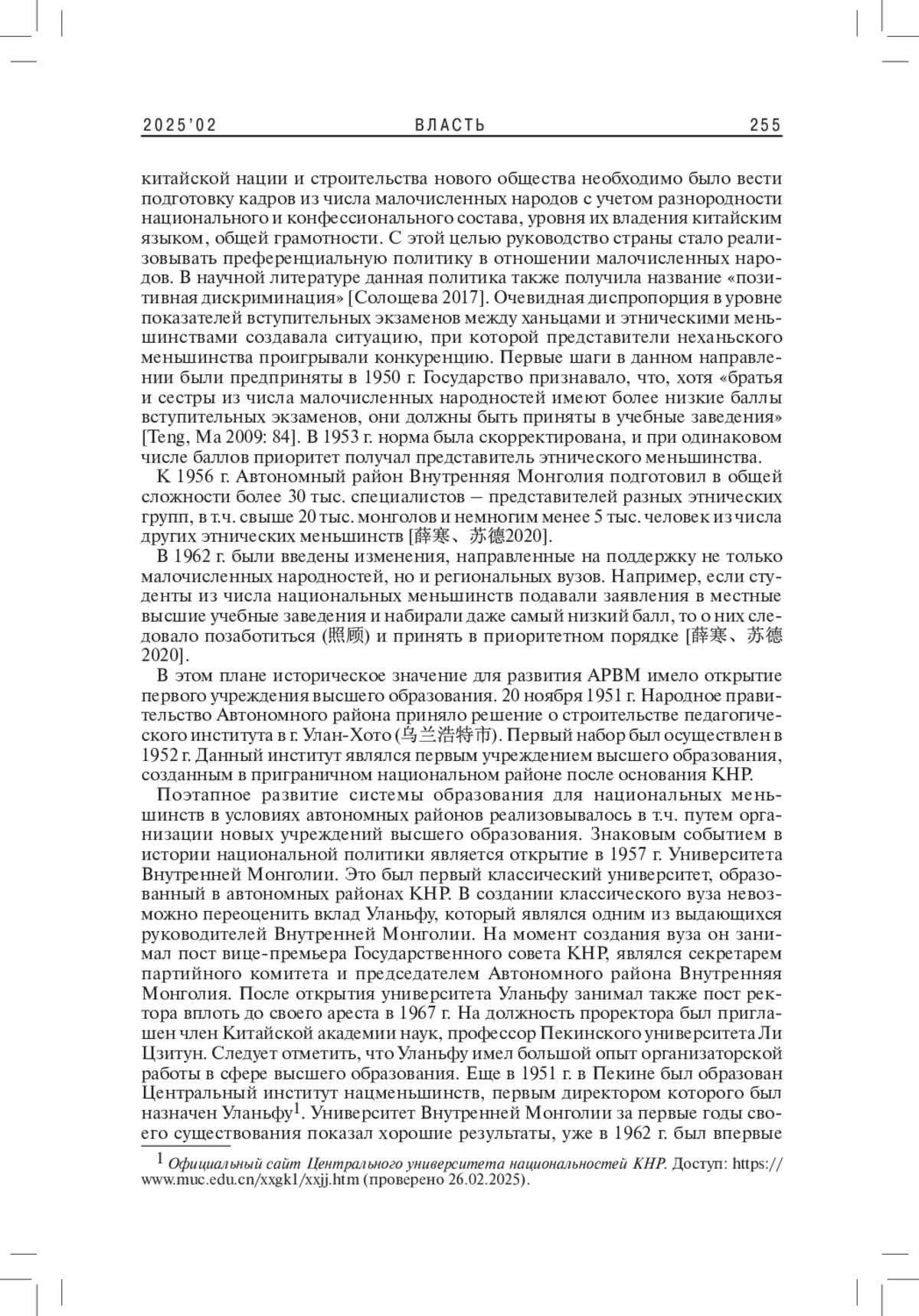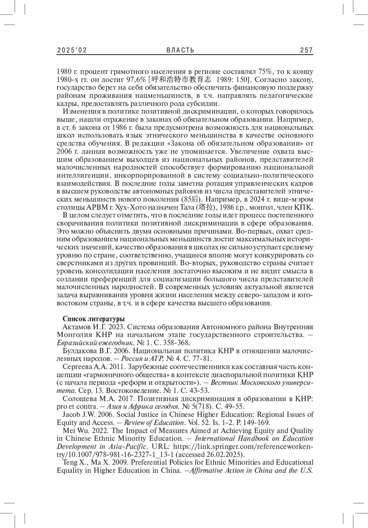 7. Teng X., Ma X. 2009. Preferential Policies for Ethnic Minorities and Educational Equality in Higher Education in China. -Affirmative Action in China and the U.S.International and Development Education (ed. by M. Zhou, A.M. Hill). N.Y. Palgrave Macmillan. P. 83-98. DOI: 10.1057/9780230100923_5