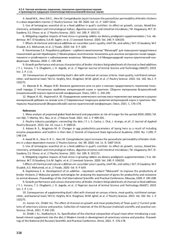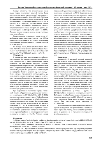 Цель: изучить мясные показатели молодняка перепелов породы техасский белый при добавлении в полнорационный комбикорм активной угольной кормовой добавки. Изучали приросты живой массы, сохранность поголовья, затраты корма на 1 кг прироста живой массы птицы и мясные показатели (живая масса птицы до убоя, масса тушки с внутренними органами и без них, выход тушки с внутренними органами и без них, масса грудных, бедренных и голенных мышц относительно потрошеной тушки, масса кожи с учетом подкожного жира, общая масса мышц) способом взвешивания и расчетным путем. При применении АУКД установлено увеличение живой массы перепелов I и II опытных групп на 6,9 % (р<0,001) и 4,5 % (Р<0,01) соответственно. Сохранность поголовья удалось увеличить на 1,2…2,5 % относительно контрольного значения. Затраты кормов на 1 кг прироста живой массы перепелов удалось снизить на 3,9…6,5 %. По предубойной живой массе птиц в I группе отмечена тенденция к увеличению на 4,1 и 0,9 %. Масса грудных мышц у перепелов I группы увеличилась на 2,4 % (р<0,05). Масса бедренных мышц относительно потрошеной тушки увеличилась на 3,6 (р<0,05) и 5,1 % (р<0,01) соответственно. Мышцы голени достоверно увеличились относительно потрошеной тушки птицы I группы на 2,0 % (р<0,05). У перепелов II группы - на 0,64 %. Во I группе птиц по массе всех мышц в тушках отмечена динамика к увеличению на 8,6 %, а во II группе произошло достоверное увеличение на 12,8 % (р<0,01). Выход мышц в тушках I опытной группы был достоверно больше контроля на 1,7 % (р<0,05), а во II группе отмечена динамика увеличения этого показателя на 4,6 %. Применение в составе комбикорма активной угольной кормовой добавки положительно влияет на мясные показатели молодняка перепелов породы «Техасский белый».