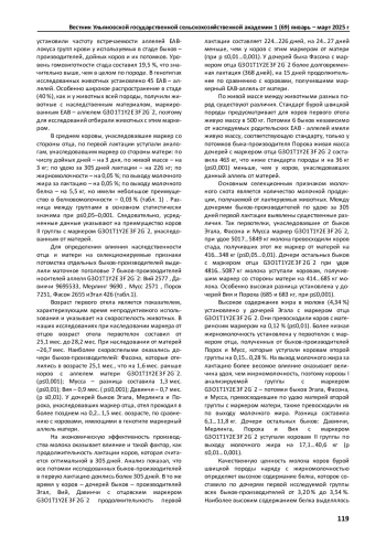 Основной фактор повышения производства молока при разведении локальных пород - повышение генетического потенциала с использованием современных методов в области генетики и селекции. Цель исследований состояла в определении степени влияния отцовского (I группа) и материнского (II группа) наследственного материала, маркированного аллелем EAB - локуса G3O1T1Y2E’3F’2G“2, на селекционные признаки потомства. Исследования выполнили по общепринятым методам иммуногенетики на поголовье - 1094 гол. в Смоленской области. Установили более весомое влияние наследственности быков - производителей, имевших и более высокий генетический потенциал молочной продуктивности по сравнению с матерями потомков, на продуктивные признаки потомства. Первотелки I группы по удою за 305 дней лактации превышали удой матерей на 11 %. По первой лактации дочери быков (из I группы) Эгала 426, Фасона 2655 и Мусса 2571 при удое 5017… 5849 кг молока превосходили на 416.348 кг (р < 0,05-0,01) коров стада (II группа), получивших идентичный маркер от матерей. По высшей лактации преимущество по основным селекционируемым признакам имели дочери быков из I группы: Фасона 2655, Мусса 2571, Давинчи 9695533 и Мерлинга 9690. Наиболее препотентными оказались гомозиготные по маркеру G3O1T1Y2E’3F’2G“2 быки-производители Давинчи с удоем дочерей 7731 кг и Мусс - 7586 кг. Гомозиготные коровы по показателям продуктивности за первую лактацию в среднем превосходили коров I и II групп. Для дальнейшего повышения генетического потенциала молочной продуктивности бурого швицкого скота предлагается анализом продуктивности потомства отдельных быков - производителей выявлять ассоциации маркерных генов с продуктивными признаками и лучшие использовать в селекционной работе.