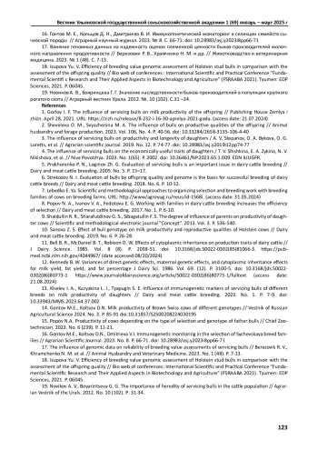 18. Isupova Yu. V. Efficiency of breeding value genomic assessment of Holstein stud bulls in comparison with the assessment of the offspring quality // Bio web of conferences: International Scientific and Practical Conference “Fundamental Scientifi c Research and Their Applied Aspects in Biotechnology and Agriculture” (FSRAABA 2021). Tyumen: EDP Sciences, 2021. P. 06045. EDN: UGEFDA
