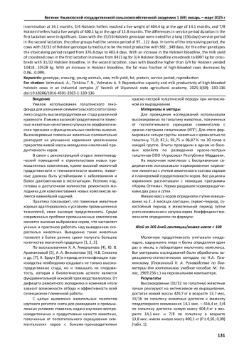 12. Динамика живой массы и репродуктивные качества помесей, полученных от поглотительного скрещивания симменталов с голштинами / А. А. Вельматов, Т. Н. Тишкина, А. Ф. Тишкина и др. // Главный зоотехник. 2024. №1. С. 47-57. EDN: FWMXGN