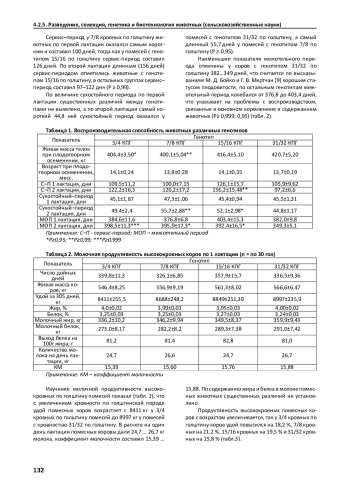 В статье приведены данные по формированию воспроизводительных и продуктивных качеств высококровных по голштину животных, полученных от поглотительного скрещивания симментальских коров с быками-произво-дителями красно-пестрой голштинской породы при интенсивном их выращивании в условиях промышленного комплекса. Для этого формировали четыре группы телок с кровностью по голштину 75,0; 87,5; 93,75 и 96,87 % по 30 голов в каждой группе. Изучали живую массу, молочную продуктивность коров, содержание жира и белка в молоке, сервиспериод, сухостойный период и межотельный период, коэффициент молочности. Высококровные 31/32 по голштину телки лучше реагируют на интенсивное их выращивание, достигая живой массы 420,7 кг при плодотворном осеменении в возрасте 13,7 мес, 15/16 по голштину телки достигли к моменту плодотворного осеменения 14,1 мес. - 416,4 кг, 3/4 по голштину достигли живую массу 404,4 кг в возрасте 14,1 мес и 7/8 по голштину в возрасте 13,8 мес имели живую массу 400,1 кг. Различия в продолжительности сервис- периода по первой лактации были несущественны. По второй лактации длинным (156 дней) сервис-периодом отметились коровы с генотипом 15/16 по голштину, в остальных группах сервис-период составил 97…122 дня. По межотельному периоду оптимальными оказались коровы с генотипом 31/32 по голштину 382.349 дней, по остальным генотипам межотельный период колебался от 376,8 дней до 403,4 дня. С увеличением кровности голштинов удой помесных коров по первой лактации возрастает с 8411 кг у 3/4 кровных по голштину помесей до 8997 кг у помесей с кровностью 31/32 по голштину. По второй лактации от коров с кровностью выше 3/4 по голштину надоили по 10418.10528 кг. С увеличением кровности по голштину у высококровных коров происходит снижение массовой доли жира на 0,06… 0,09 %.