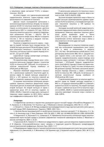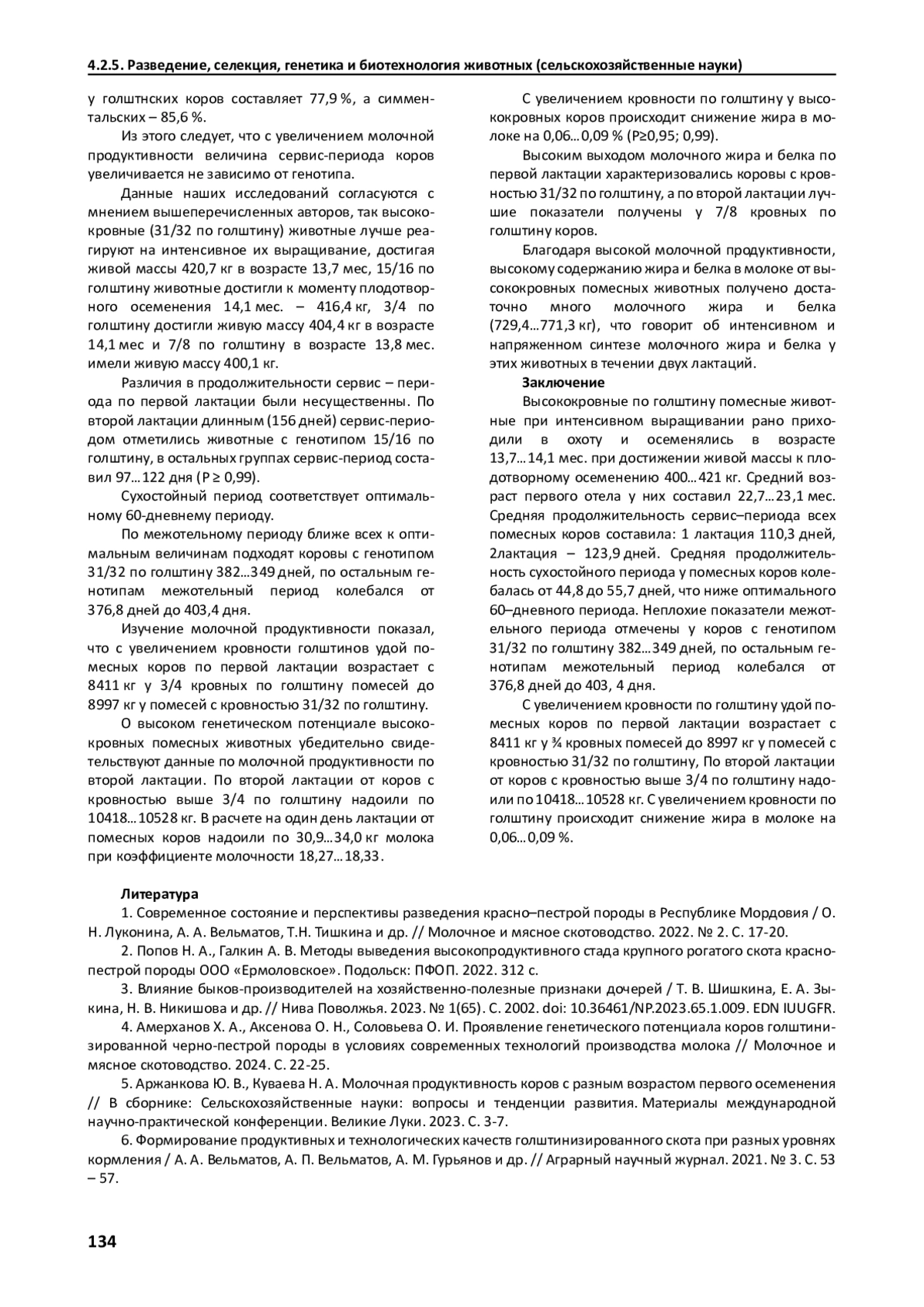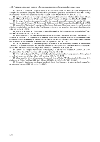 4. Амерханов Х. А., Аксенова О. Н., Соловьева О. И. Проявление генетического потенциала коров голштини-зированной черно-пестрой породы в условиях современных технологий производства молока // Молочное и мясное скотоводство. 2024. С. 22-25. EDN: VKNKGW