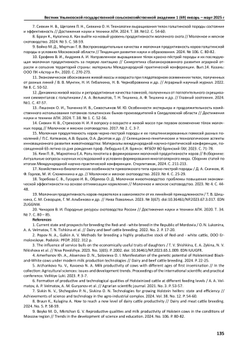 5. Аржанкова Ю. В., Куваева Н. А. Молочная продуктивность коров с разным возрастом первого осеменения // В сборнике: Сельскохозяйственные науки: вопросы и тенденции развития. Материалы международной научно-практической конференции. Великие Луки. 2023. С. 3-7. EDN: ZNYGCZ