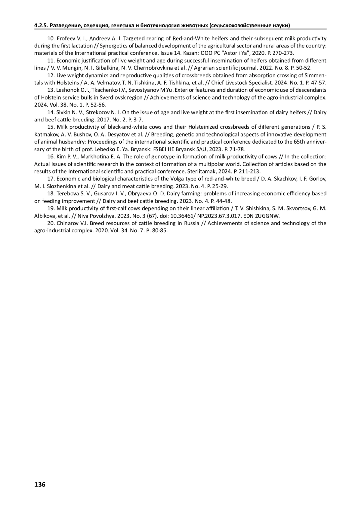 10. Ерофеев В. И., Андреев А. И. Направленное выращивание тёлок красно-пёстрой породы и их последующая молочная продуктивность за первую лактацию // Синергетика сбалансированного развития аграрной отрасли и сельских территорий страны: материалы Международной практической конференции. Вып.14. Казань: ООО ПК “Астор и Я”, 2020. С. 270-273. EDN: IECVDC