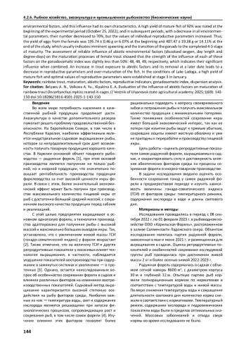 В представленной статье приведены результаты изучения репродуктивных показателей группы самок радужной форели (Oncorhynchus mykiss), состоящей из 100 особей, выращиваемых в садках в Ладожском озере. Целью исследований была оценка репродуктивных показателей самок радужной форели, выращиваемых в садках, и характеристика силы и достоверности влияния абиотических факторов среды на процессы созревания форели в икорно-товарном производстве. Для достижения поставленной цели применяли морфобиологический и дисперсионный анализы. Установили, что созревание рыб зависело от изменений факторов внешней среды, и это влияние имело свои особенности. В начале опытного периода (25 октября 2022 года) был отмечен высокий выход созревших рыб - 92%, а в последующие периоды при снижении всех параметров среды их количество сократилось до 70%, но при этом возросли значения индивидуальных репродуктивных показателей. Так, выход икры от самки составил 195,74±0,46 г или 6,07% в начале и 407,47±19,38 г или 14,11% в конце исследования, что обычно свидетельствует о близком нересте и переходе гонад к завершенной 4-5 стадии зрелости. Оценка достоверного влияния на процессы созревания самок форели абиотических факторов среды (растворенный кислород, длина светового дня и градусодни) показала, что сила влияния каждого из этих факторов на ГСИ составила чуть меньше 50%: 48, 48, 49 соответственно, что свидетельствует о значительном их влиянии при совместном воздействии. Таким образом, увеличение продолжительности выдерживания форели при совместном воздействии абиотических факторов и ее изъятие в более поздние сроки приводит к уменьшению репродуктивных показателей и перезреванию рыбы. В условиях Ладожского озера высокий выход зрелых рыб и оптимальные значения репродуктивных показателей установлены на этапе 3 в январе.