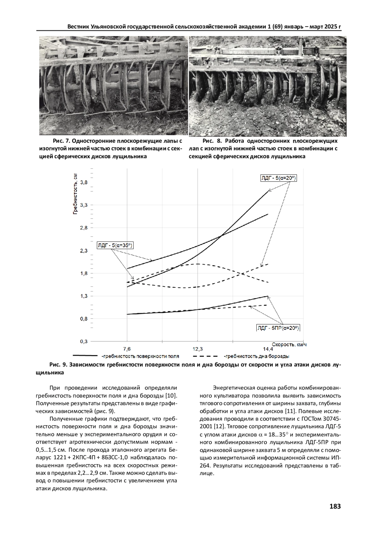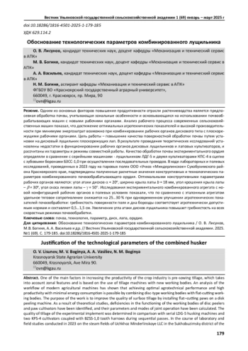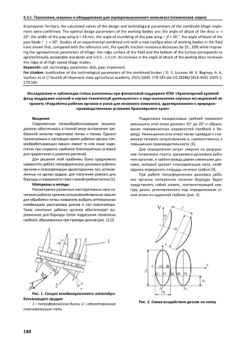 Одним из основных факторов повышения продуктивности отрасли растениеводства является предпосевная обработка почвы, учитывающая зональные особенности и основывающаяся на использовании почвообрабатывающих машин с новыми рабочими органами. Анализ рабочего процесса современных сельскохозяйственных машин показал, что достижение оптимальных агротехнических показателей и высокой производительности при минимуме энергозатрат возможно при комбинировании рабочих органов дискового типа с плоскорежущими рабочими органами. Цель работы - повышение качества поверхностной обработки почвы путем установки на дисковый лущильник плоскорежущих лап. В результате проведения теоретических исследований установлены недостатки в функционировании рабочих органов дисковых лущильников и лаповых культиваторов, и рассчитаны их параметры и режимы совместной работы. Качество обработки почвы экспериментального орудия определяли в сравнении с серийными машинами - лущильником ЛДГ-5 и двумя культиваторами КПС-4 в сцепке с зубовыми боронами БЗСС-1,0 при осуществлении последовательных проходов. В ходе лабораторных и полевых исследований, проведенных в 2023 году на паровых полях ООО «Учхоз «Миндерлинское» Сухобузимского района Красноярского края, подтверждены полученные расчетные значения конструктивных и технологических параметров комбинированного почвообрабатывающего орудия. Оптимальными конструктивными параметрами рабочих органов являются: угол атаки дисков а = 20о, ширина крыла лапы b = 18 мм, угол крошения крыла лапы - р= 30о, угол скоса лезвия лапы - у = 50°. Исследования экспериментального комбинированного агрегата с новой конфигурацией рабочих органов в полевых условиях показали, что по сравнению с эталонным агрегатом удельное тяговое сопротивление снижается на 25…30 % при одновременном улучшении агротехнических показателей почвообработки: гребнистость поверхности поля и дна борозды соответствует агротехнически допустимым нормам и составляет 0,5…1,5 см. Увеличение угла атаки дисков лущильника повышает гребнистость на всех скоростных режимах почвообработки.