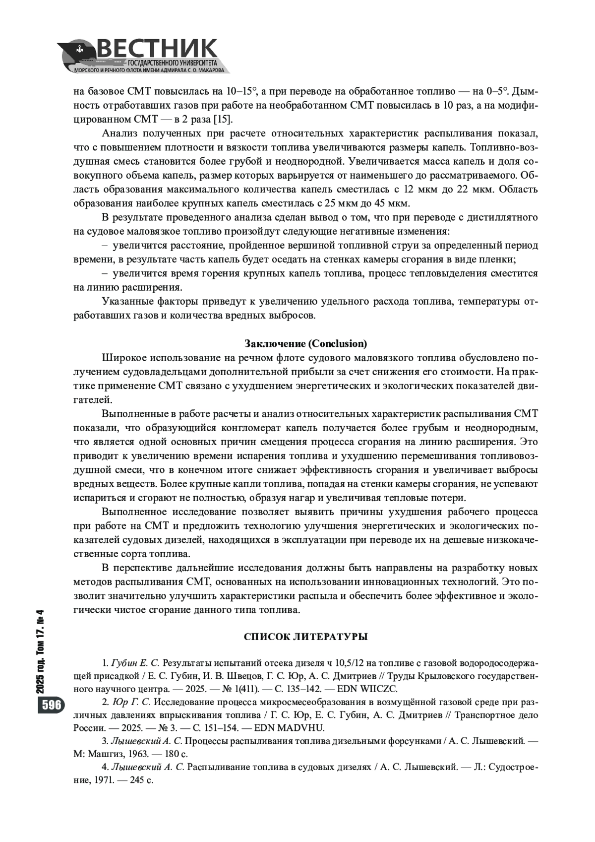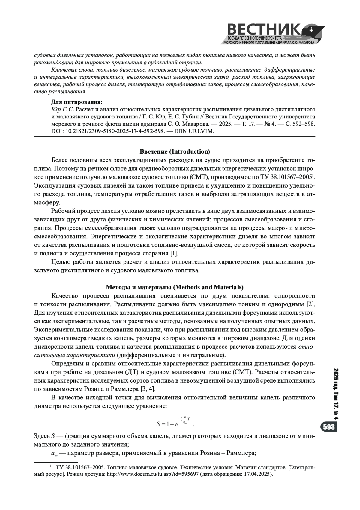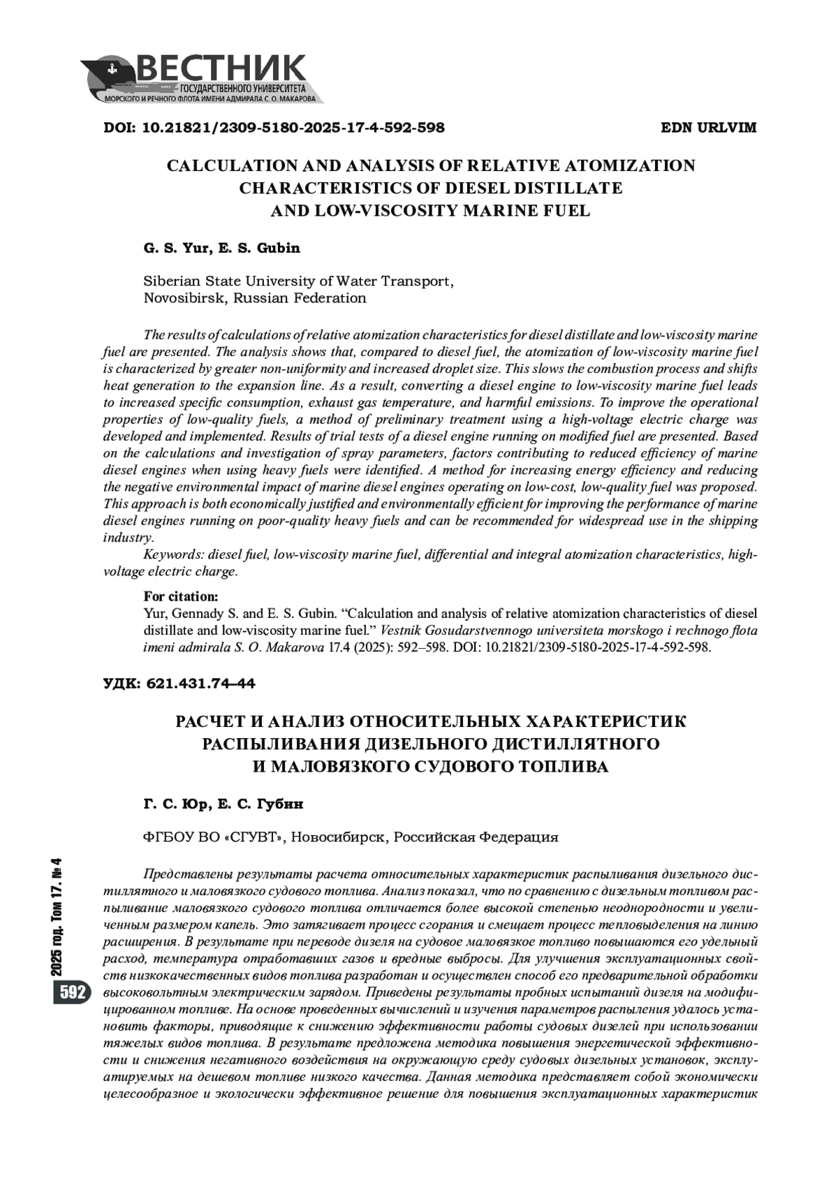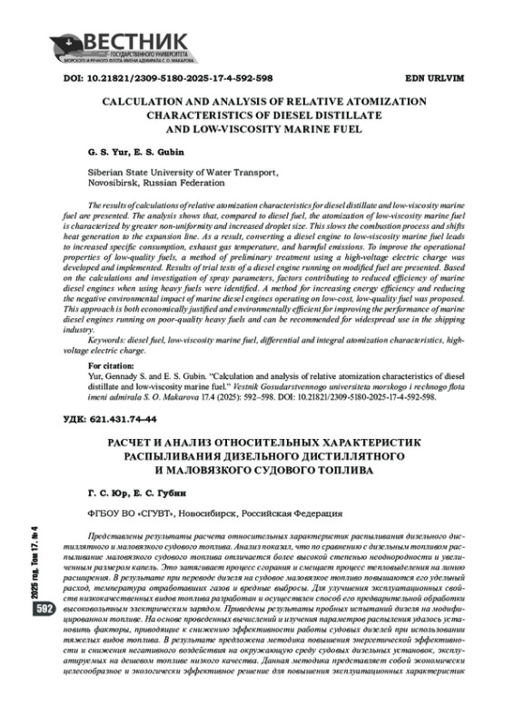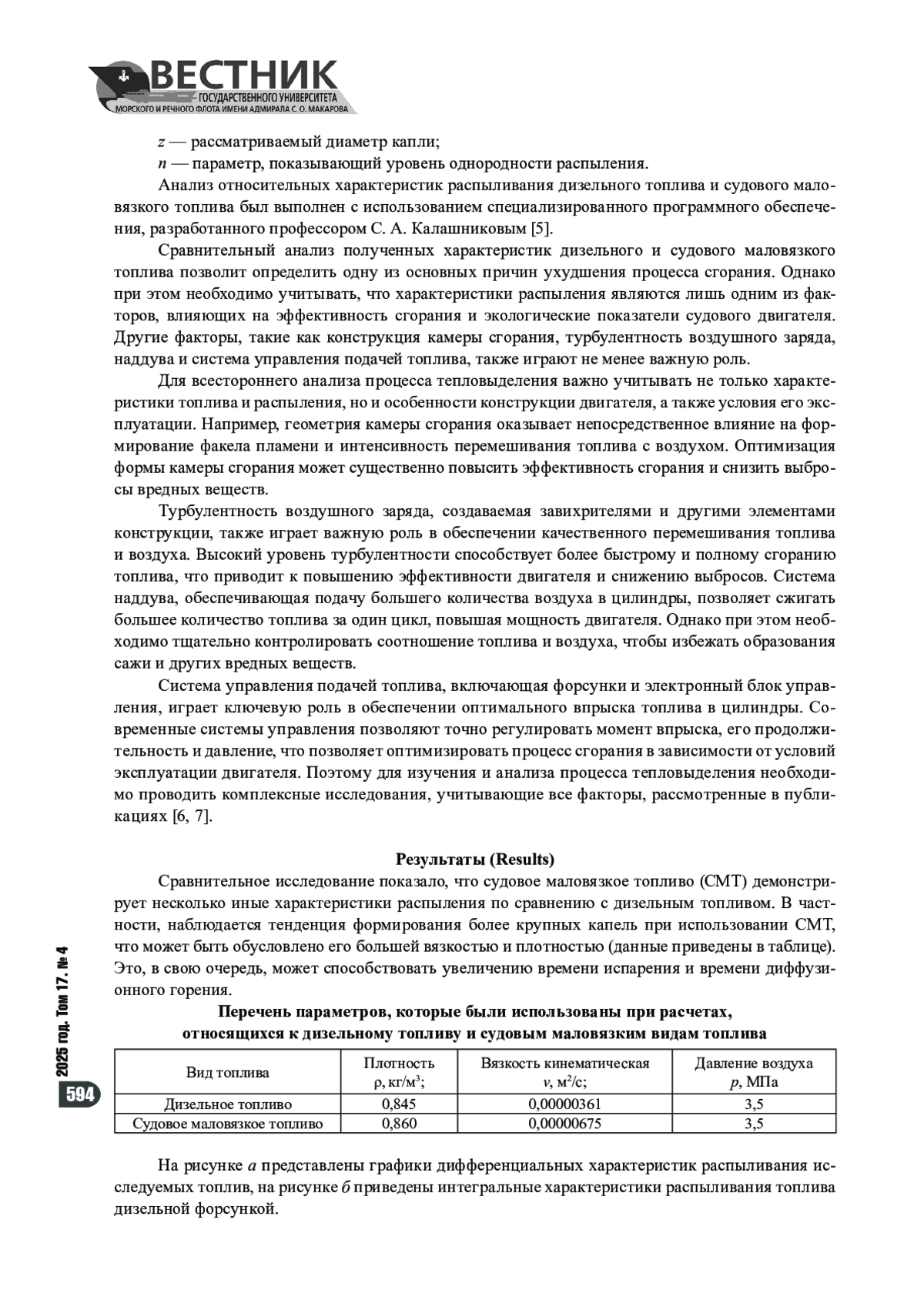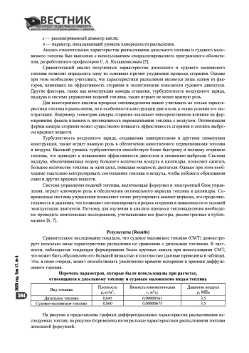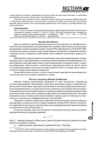Статья: Расчет и анализ относительных характеристик распыливания дизельного дистиллятного и маловязкого судового топлива (2025)