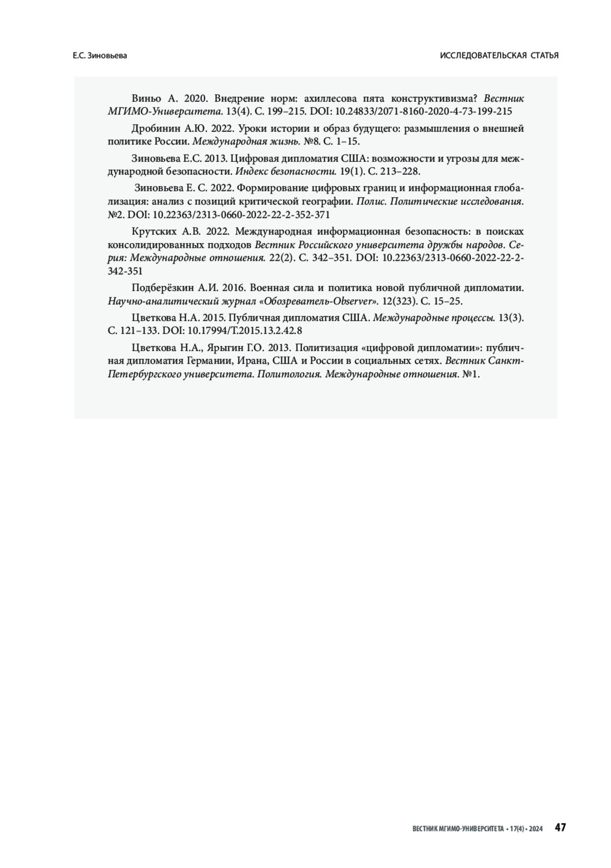 7. Зиновьева Е. С. 2013. Цифровая дипломатия США: возможности и угрозы для международной безопасности. Индекс безопасности. Т. 19. No. 1. С. 213-228.